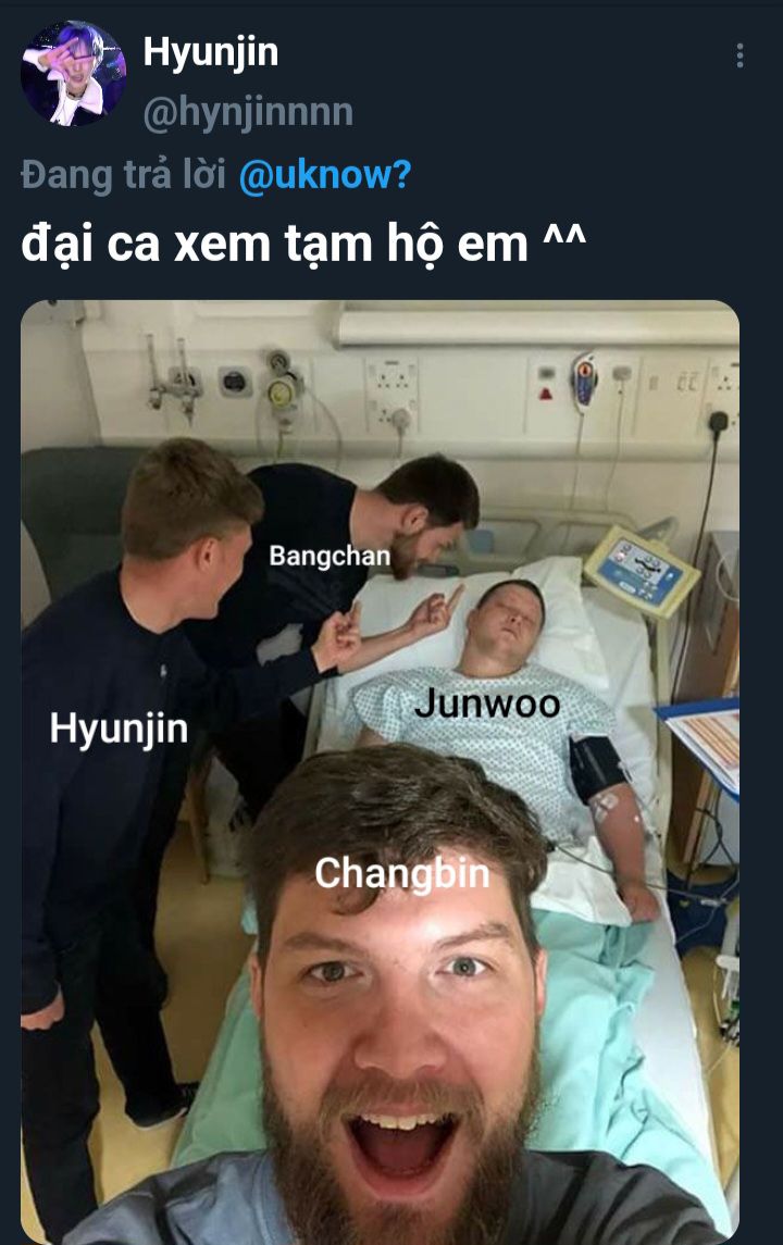 Bệnh viện chỗ Junwoo nhập viện rất chặt nên ảnh không chụp được, thêm cái cả 3 đều quên điện thoại. Nên yeah, Hyunjin đã về và edit tấm ảnh này coi như phản ảnh sự việc.