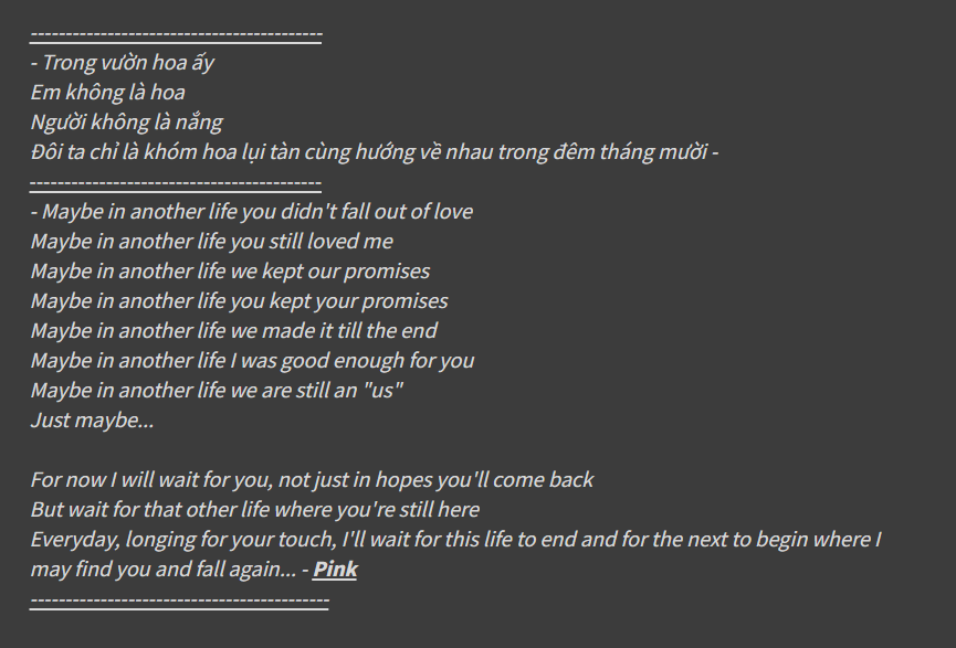 Hôm nay tôi rảnh nên tôi sẽ tổng hợp lại toàn bộ thơ ca, khúc hát, quoet, mà tôi đã viết trong fandom :>