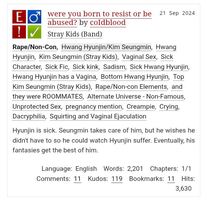 "Tao biết. Nhưng mày vẫn muốn, phải không? Dù có bệnh đi chăng nữa, mày vẫn muốn tao cưỡng hiếp mày", Seungmin cười, nghiêng cổ sang một bên, "Đồ con đĩ." Cậu đè chân Hyunjin xuống giường bằng chân mình, bò lên người em và kéo quần mình xuống vừa đủ để đưa dương vật ra ngoài và đặt nó vào lối vào của em.