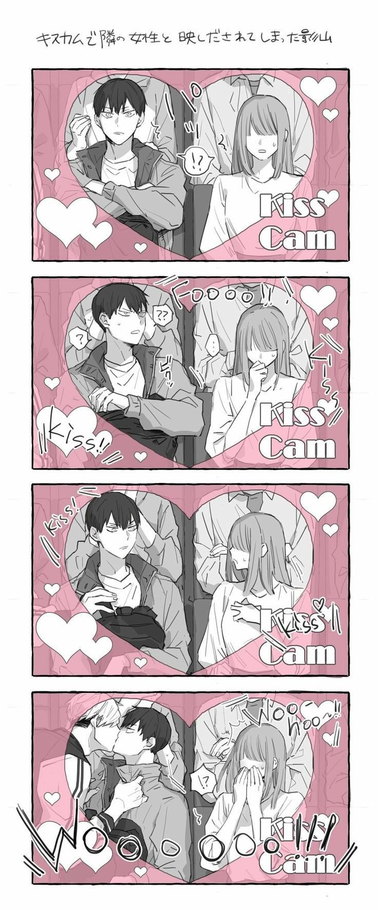 Bỗng cậu nghe tiếng "Ồ" lên và nó càng ngày càng lớn. Theo hướng nhìn của mọi người về phía màn hình lớn, màn hình nhấp nháy chữ "Kiss Cam" cùng hiệu ứng hình trái tim màu hồng. Máy quay bắt đầu lia đến vài cặp đôi và những người đó lại bắt đầu hôn nhau. Cậu mới đầu cũng không hiểu lắm, nhưng sau vài lần mấy cặp đôi trên màn hình hôn nhau thì cậu đã nhận ra đó là gì.