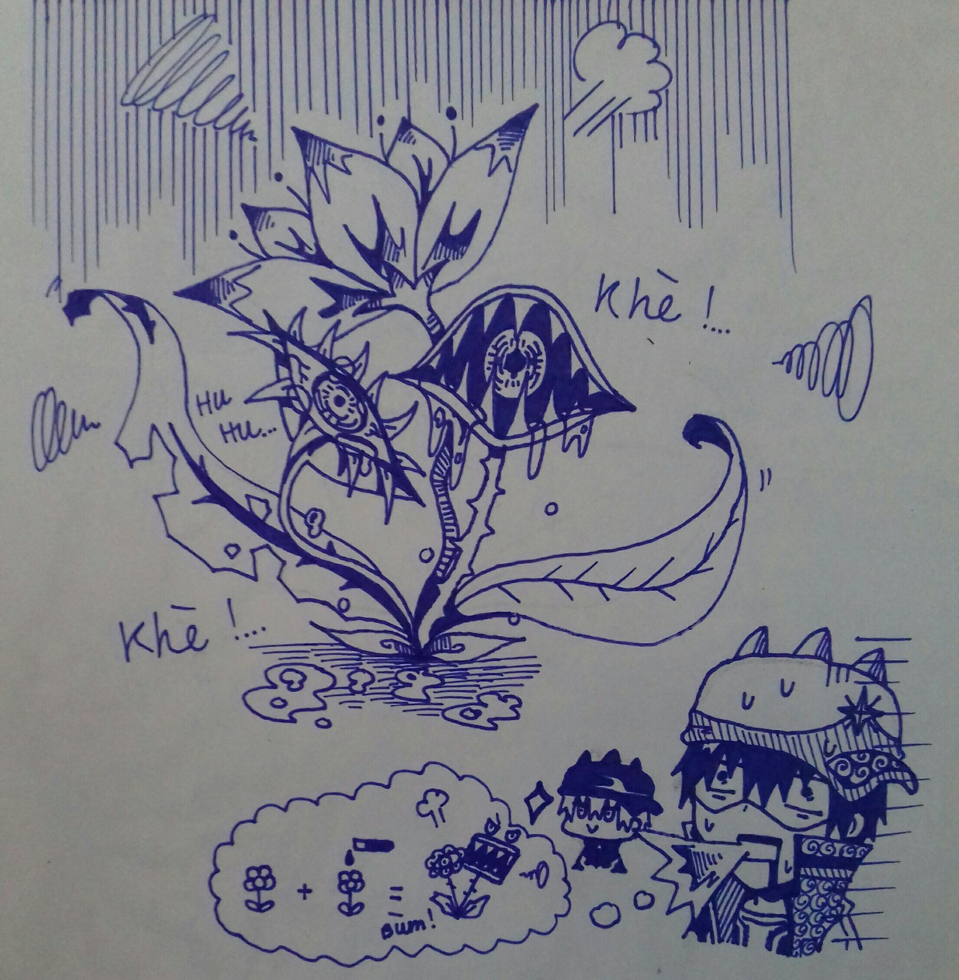*Từ trong túi của cậu móc ra một lọ dung dịch với chất màu kì lạ , cậu đi tớ một chỗ bông hoa mở nắp ra và đổ một tí dung dịch lên bông hoa đó , rồi sao đó cậu đứng lên rồi lùi lại ra một xa chút , loài hoa đó bắt đầu rung lắc khá mạnh , càng ngày càng lớn dần lên , từ rễ của nó bắt đầu mọc ra thêm một chiếc lá bị rách và mọc thêm hai cành nữa nhưng nó giống như một con quái vật vậy