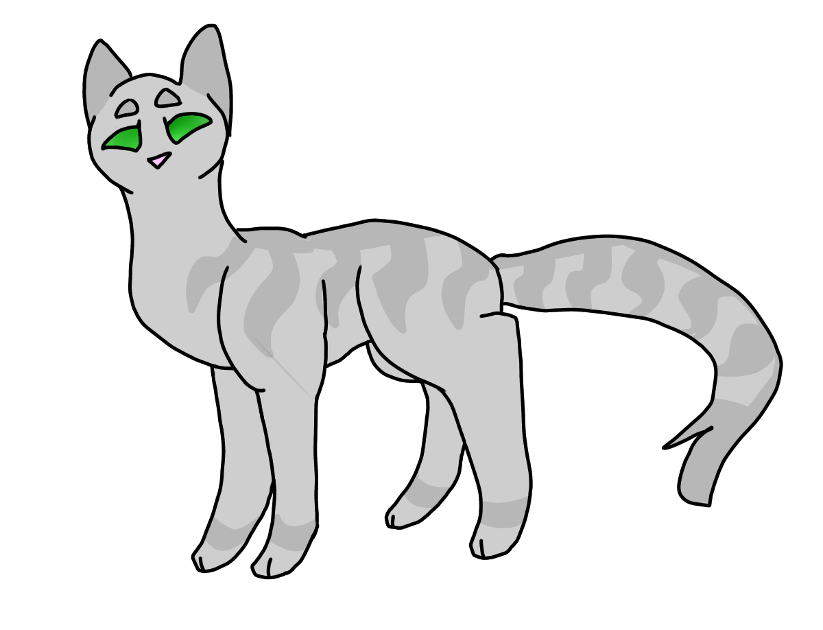 Looks: A dark grey she-cat with a black stripe down her back and tail. She has a lighter grey for her stomach, chest, paws, inside the ears, and under the tail. She has bright green eyes.
