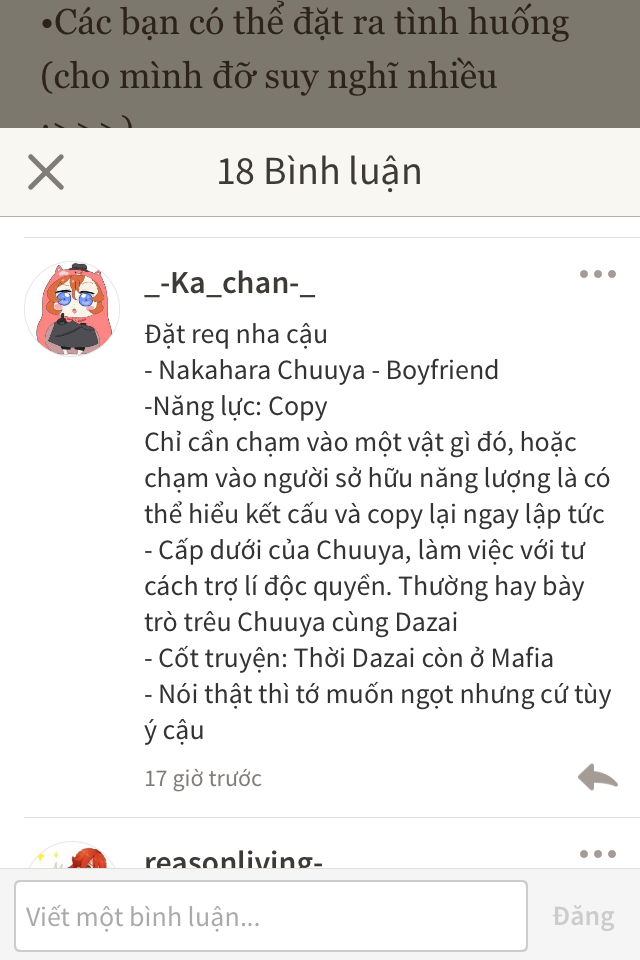 Đến lượt bạn cười đểu, và nụ cười này không hề kéo dài như mọi ngày. Nó liền tắt liệm khi mà Chuuya bắt đầu nghiêng người. Hắn thì muốn lại gần còn bạn thì muốn tránh xa. Mệt mỏi, hắn đưa một tay ra sau gáy của bạn, kéo bạn lại gần. Thì thào ngay bên tai bạn với âm thanh ma mị.