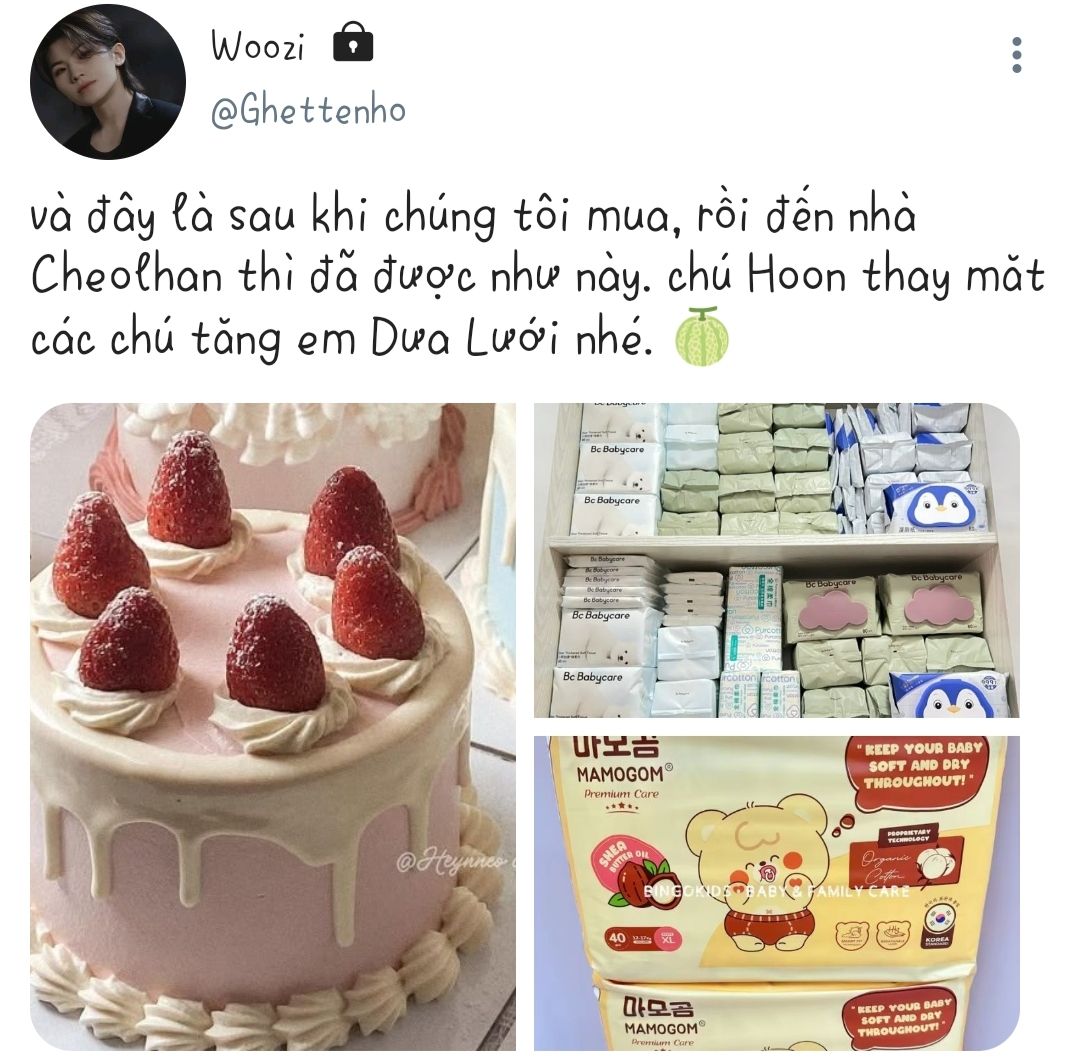 Rồi các chú chạy qua nhà chơi mà còn mua đồ cho em Dưa Lưới với bánh kem dâu tây cho cậu.