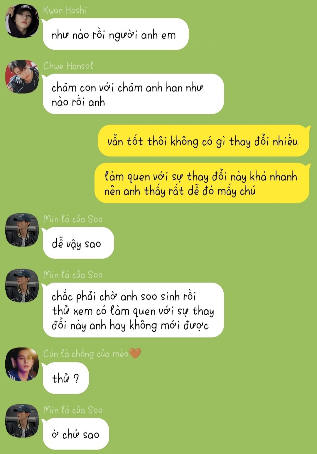 Cùng lúc đó thì group của hắn cũng hỏi han về việc chăm cậu và em Dưa Lưới....