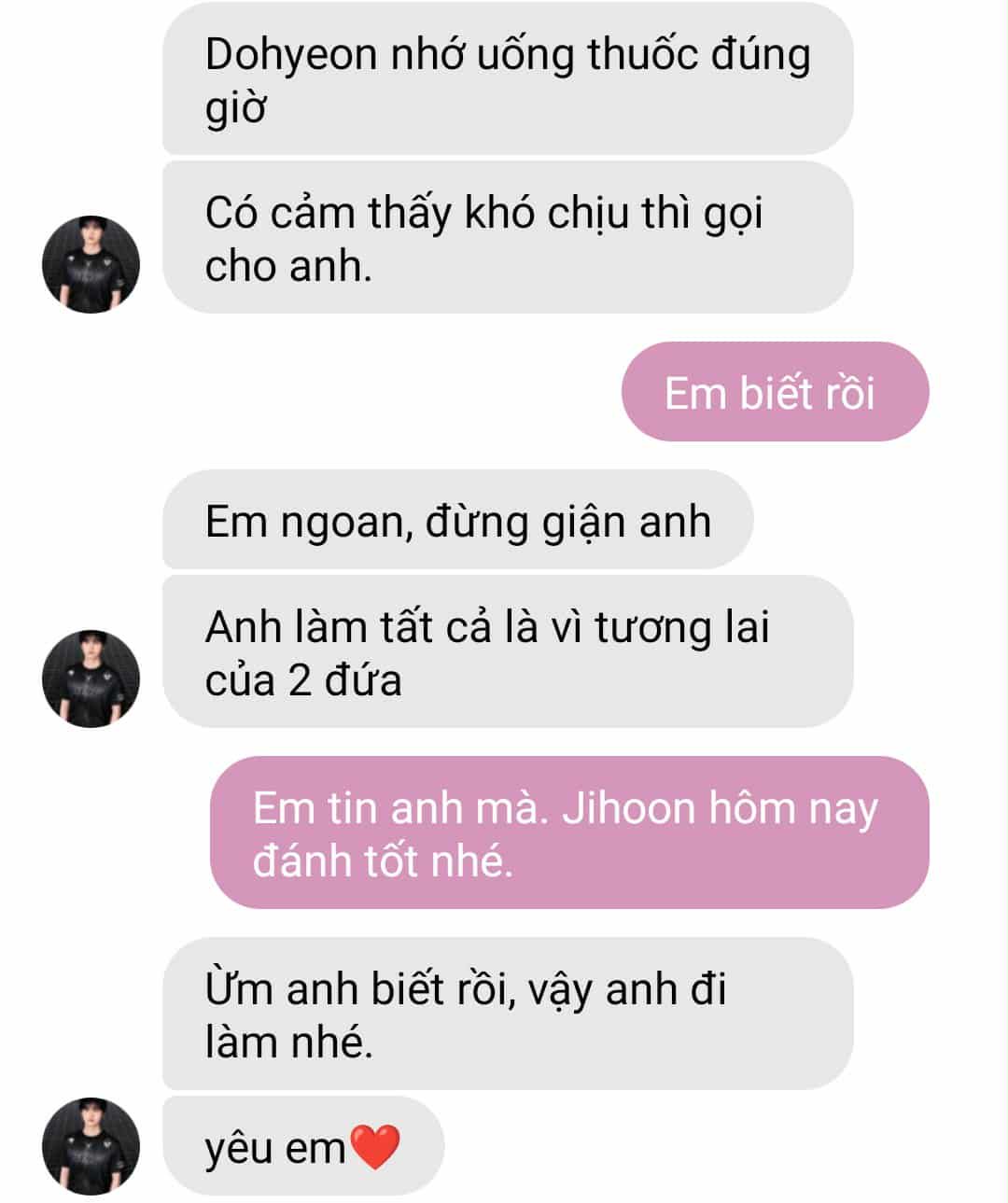 Dohyeon mím môi, đôi mắt đỏ hoe, nước mắt trực trào. Em siết nhẹ tay anh.