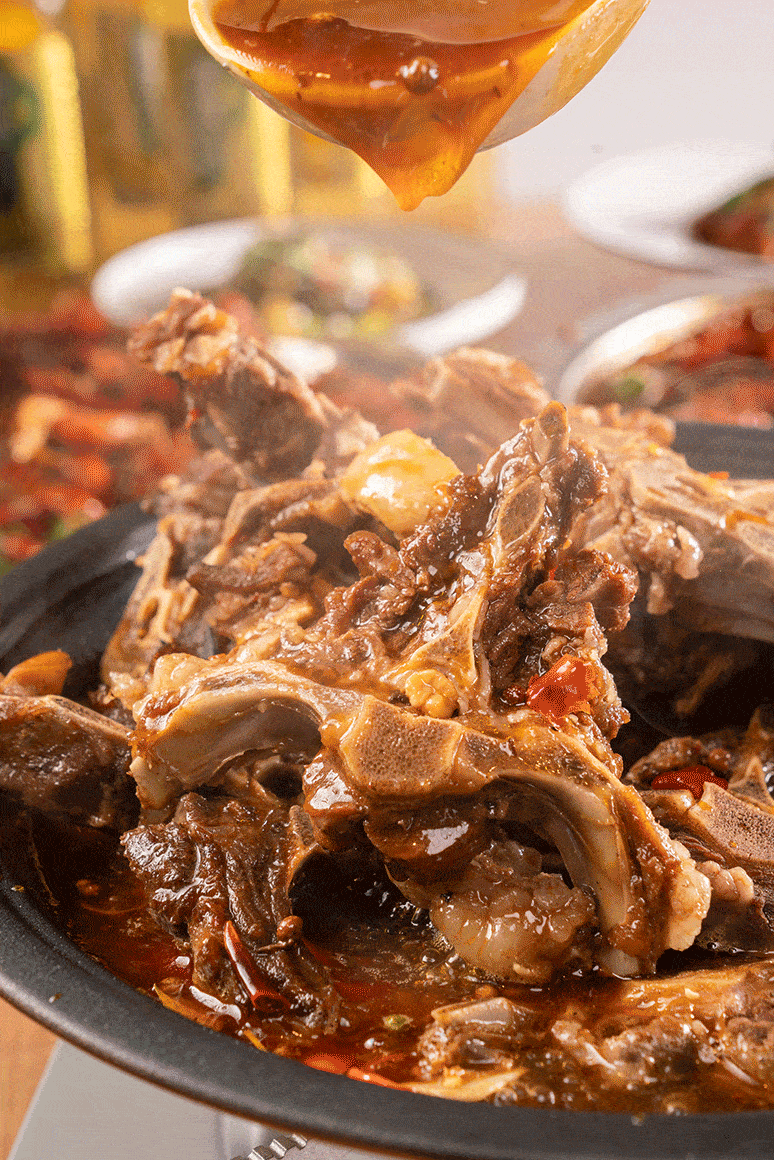 Giang Tri bỏ vỏ quế, hoa hồi, thảo quả, hoa tiêu vào chảo, lại nêm cùng các loại xì dầu, rượu gia vị, đảo đều thành một hỗn hợp dầu ớt đặc quánh cay nóng, vị cay phải nói là xộc thấu trời xanh, kích thích tuyến mồ hôi miệng hoạt động hết công suất. Lúc này, Giang Tri đổ xương dê vào, dùng xẻng đảo đều xương cùng dầu ớt cho thấm đều gia vị, cũng để hương vị của xương dê từ từ thấm ra nước sốt.