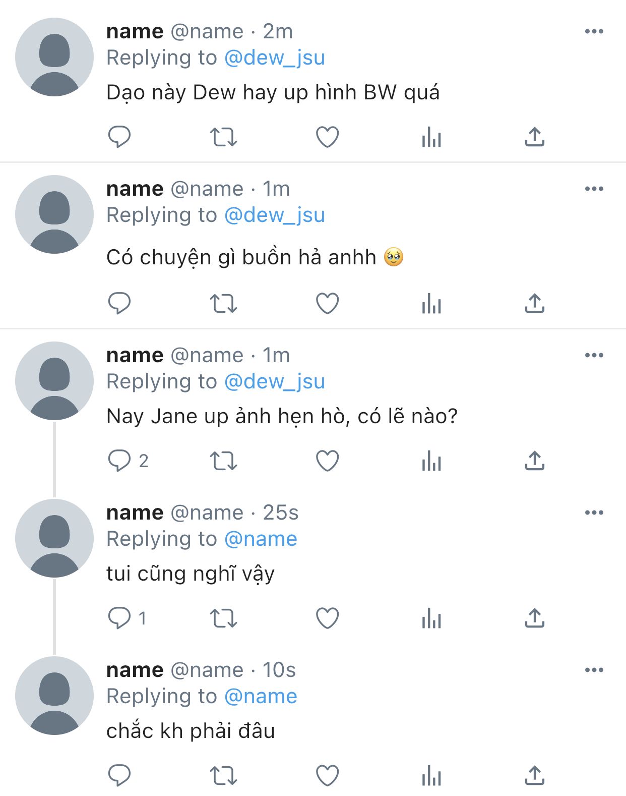 Jane buông điện thoại, lòng nghĩ chắc Dew giận rồi, không biết nên thành thật việc người yêu tin đồn này cho anh không. Đang lướt twitter thì Jane bỗng khựng lại, mặt tối sầm xuống