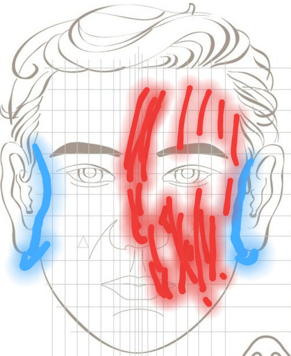 Dùng cầy sao chổi đầu dương (đầu 1 chia) quẹt vùng màu đỏ (phần bên trái mặt) như hình 30 giây. Dùng cây sao chổi quay xung quanh lổ tai như hình đường màu xanh, mỗi bên tai 30 cái.