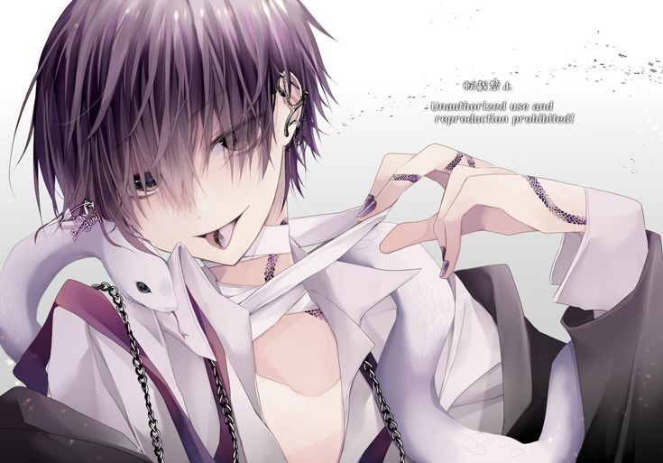 - Ngoại hình: Mái tóc dài qua đầu gối màu tím than, nhưng đã được cắt gọn khi đến thế giới này, mái che gần như cả mắt, bình thường sẽ dùng kẹp tăm hình hoa cúc cố định lại, có một bím tóc nhỏ xinh bên phải. Mắt hai màu đen mum và đỏ rượu, đồng tử hình trăng khuyết đỏ tươi và đen tương phản. Có hình xăm cánh lông vũ trên lưỡi, hình xăm con rắn to màu tím trên cổ và cánh tay phải, các con rắn nhỏ màu đen trên tay trái, bụng, bắp đùi. ➯ [Kiểu tóc như trên hình].