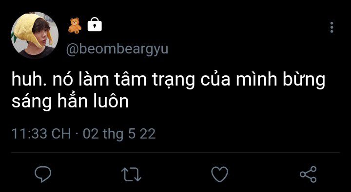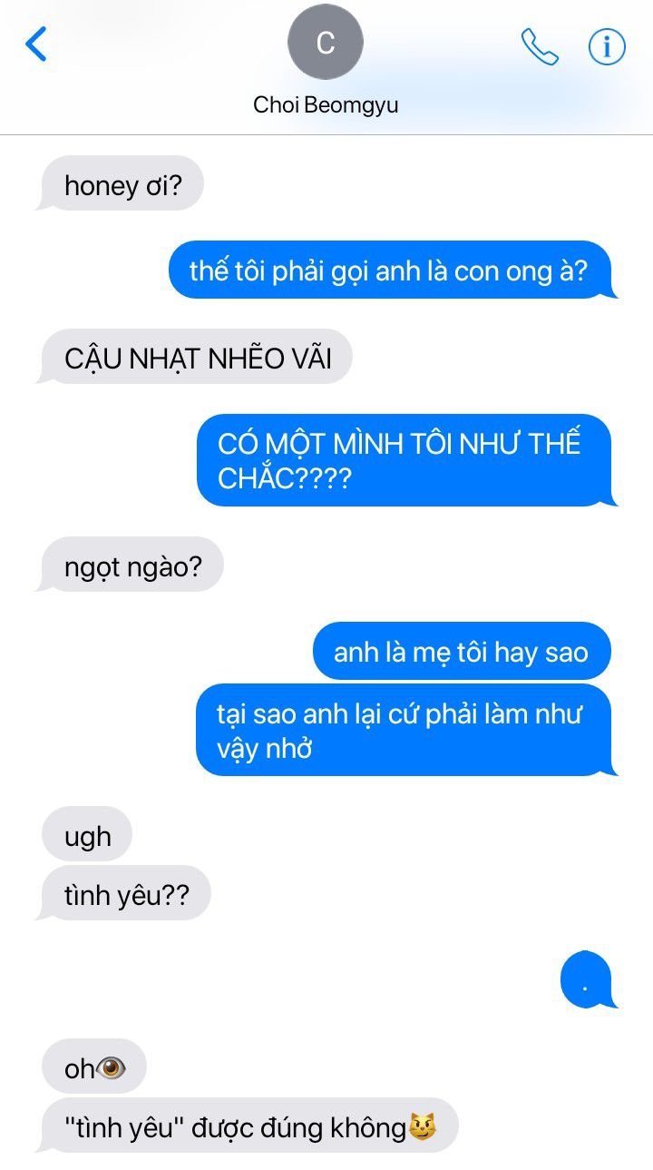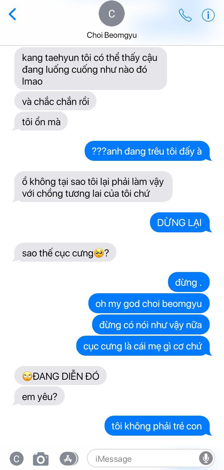 "Ổn mà, tình yêu." Nụ cười nhếch mép của anh biến thành một tràng cười khi mặt Taehyun ngay lập tức sa sầm, cau có nhìn anh. Dù vậy, Beomgyu vẫn để ý đến chút màu hồng nhẹ trên tai của cậu.