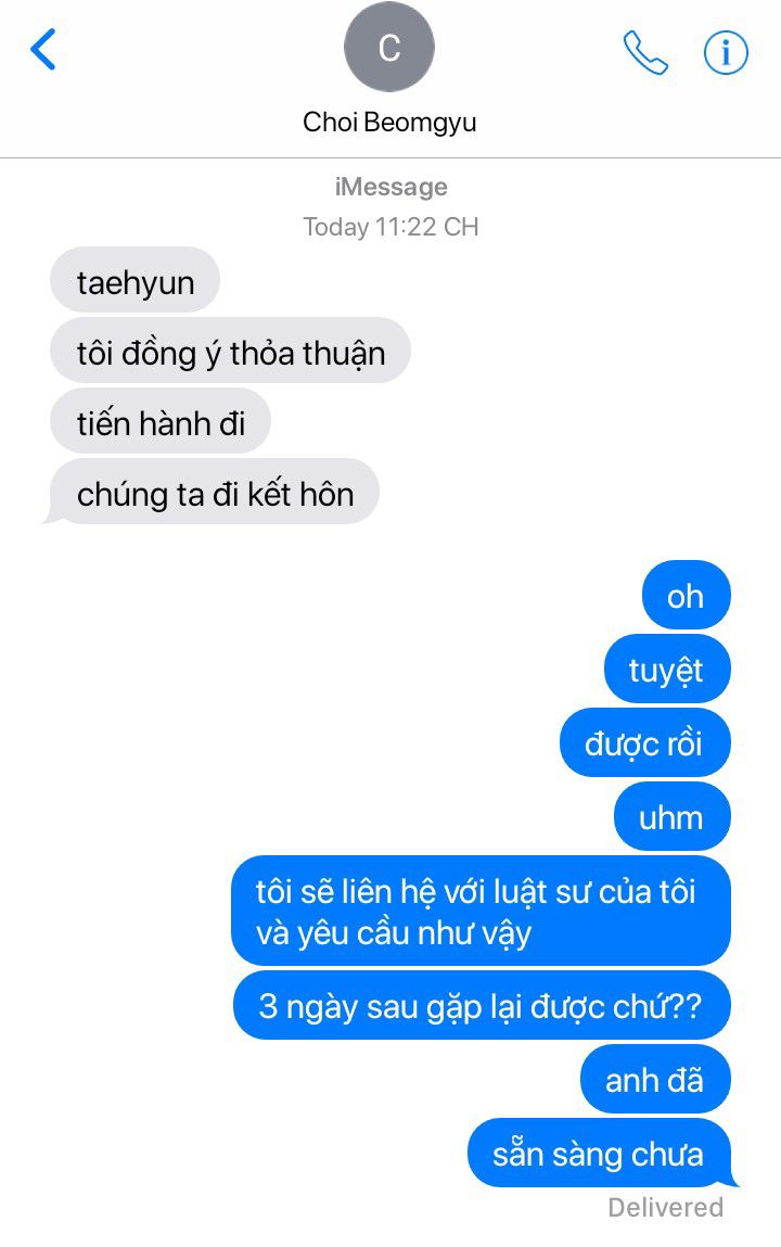 Cả hai đều giật mình khi nghe thấy tiếng chuông cửa, Taehyun nở một nụ cười thật trân, mở cửa để cho luật sư của mình vào.