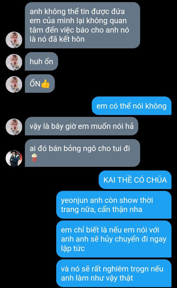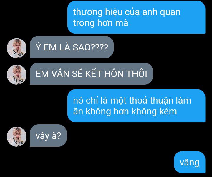 Taehyun gật đầu. "Tôi đi nghe điện thoại một chút, tin tức về cuộc hôn nhân này sẽ sớm được lan truyền thôi, nhưng nó chỉ nhằm hướng về phía của ba mẹ anh để tránh việc giới truyền thông phát giác và xâm phạm quyền riêng tư của chúng ta. Anh hiểu chứ?"