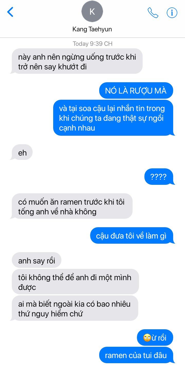 "Ừm, tôi nghĩ tôi nên uống một ly." Anh cười, nhìn Taehyun và ra hiệu về phía ly rượu.
