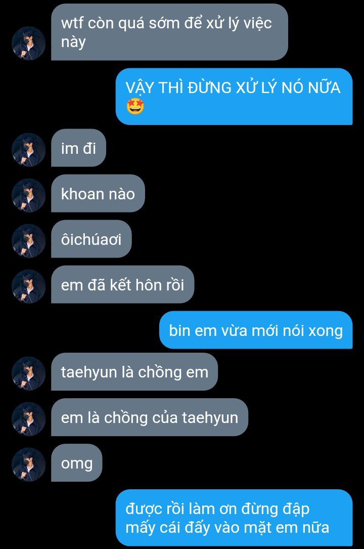 "Theo ý tôi, nếu anh muốn làm cho cuộc hôn nhân này trở nên đáng tin cậy hơn, thì được thôi. Nhưng nếu anh không thoải mái, tôi luôn sẵn sàng cho anh một trong những chỗ ở đây." Taehyun nhún vai, duy trì giao tiếp bằng mắt.