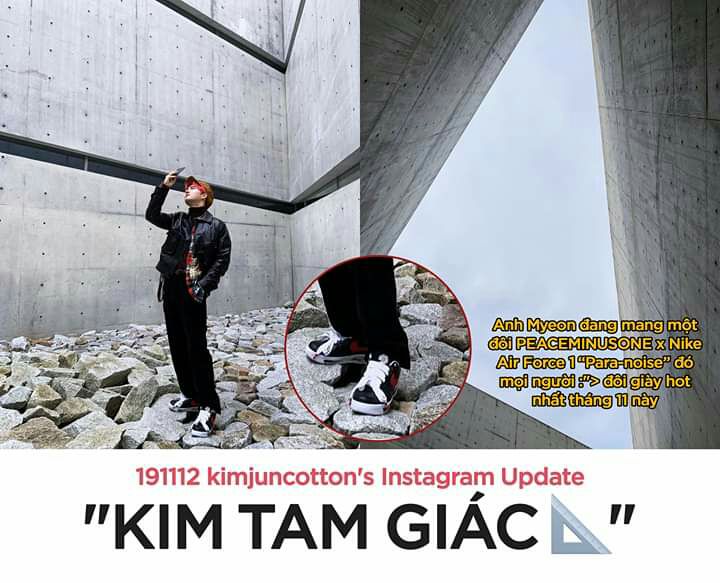 Mà ảnh lúc trưa thì không thấy chân đâu hóa ra là để chờ qua đây để tung lên đổ dồn mọi sự chú ý vào đôi PEACEMINUESONE x Nike Air Force 1 "Para-noise" đây mà :'( :'(. Đôi giày hot nhất tháng 11 này và cũng là sản phẩm kết hợp giữa Nike và G-Dragon đó mọi người. Đôi của anh Myeon có dấu swoosh màu đỏ thì chính là phiên bản dành riêng cho Hàn Quốc đó nha.