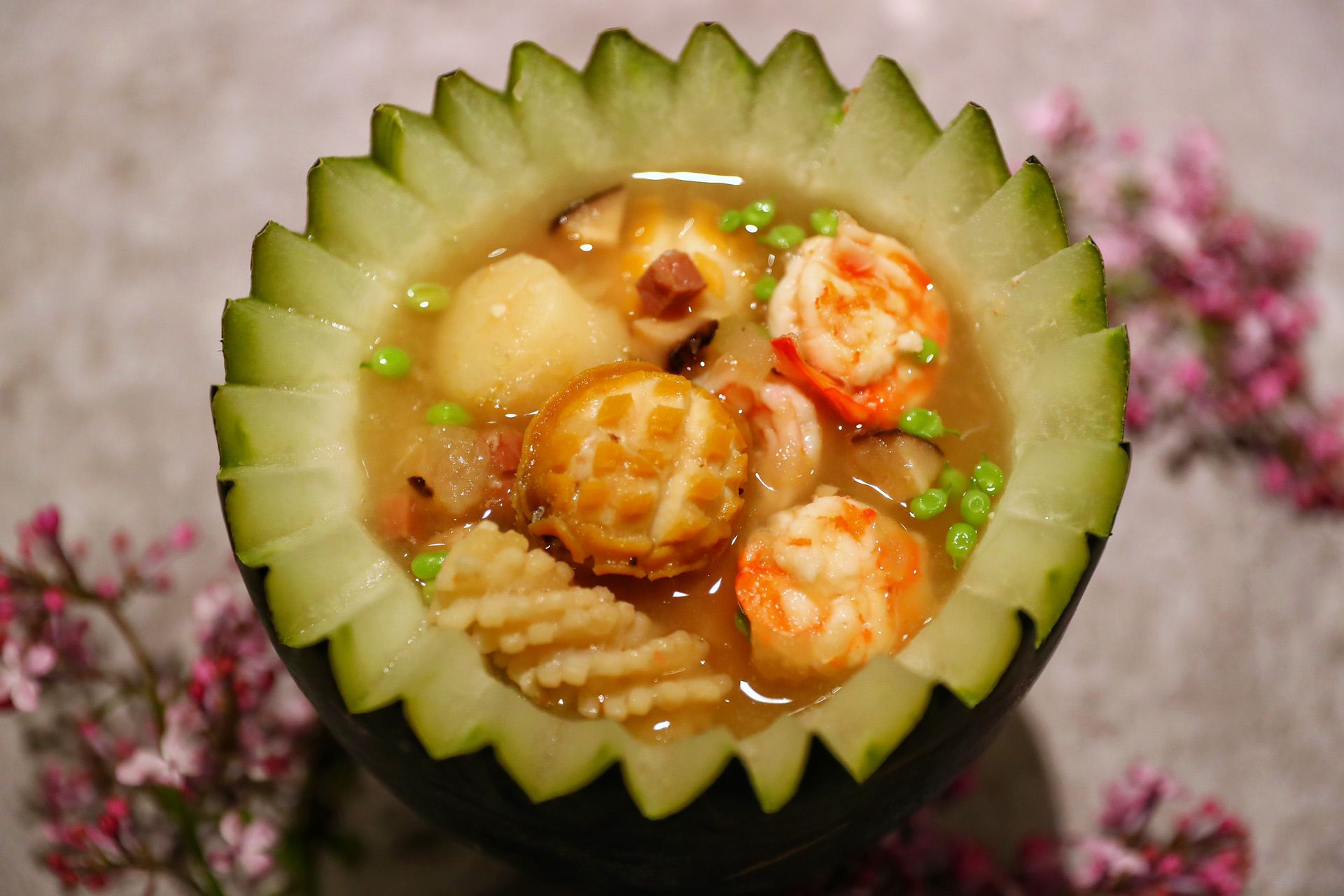 Huyên Hiểu Đông cười đặt một chung bí đao trước mặt cô, bí đao xanh như ngọc có nhồi thịt tôm tươi, thịt cua, sò điệp khô, măng khô, hạt sen, chân giò hun khói thái mỏng ở bên trong, nước dung trong veo, múc một thìa vào miệng, mọi thứ mềm mại như tan trong miệng, ngon nuốt lưỡi. Thi Ký Thanh thở dài nói: "Giảm béo quá khó khăn."