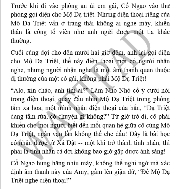 Lâm Nho Nhỏ bị dọa sốc, không thể tưởng tượng được người gọi tới là Cổ Ngạo, cũng chính là người chồng thứ hai của Mã Nhã Thanh, vội vàng nhìn vào màn hình điện thoại, liếc mắt nhìn dãy số một cái, môi run run cúp máy, sau đó vội vàng thả lại trên bàn trà.