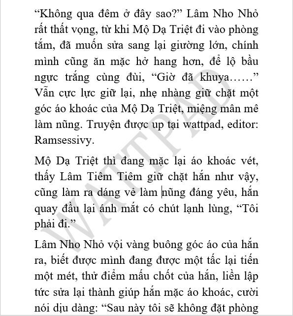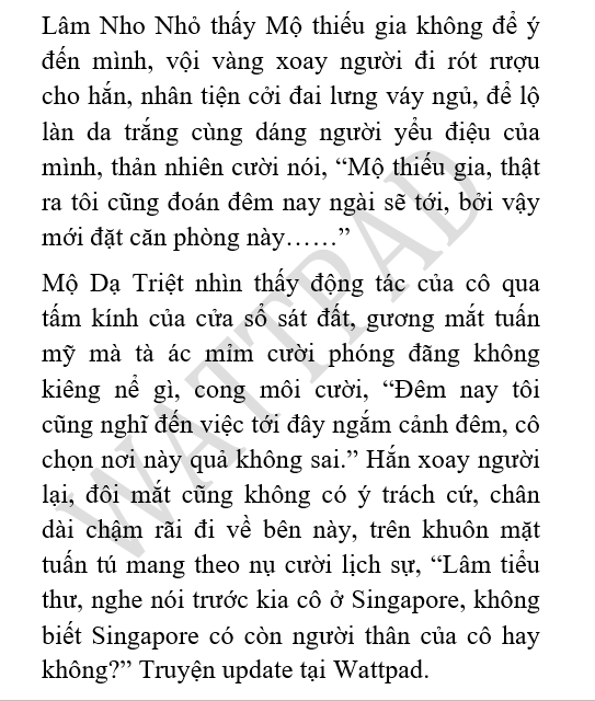 "Đương nhiên là một mình." Lâm Nho Nhỏ phong tình vạn chủng trả lời hắn, nhu thuận cởi áo khoác vét cho hắn, móc lên giá treo, giống một cô vợ nhỏ dịu dàng, hoặc là tình nhân, "Mộ thiếu gia, ngâm tắm nước nóng một mình ở trong này thật nhàm chán, may là ngài đến rồi. Cảnh đêm nơi này rất được, có thể nhìn thấy toàn bộ cảnh đêm của Cẩm thành, đúng là thiên đường chốn nhân gian......Tôi lớn như vậy, nhưng chưa từng được đến nơi cao cấp như thế này."
