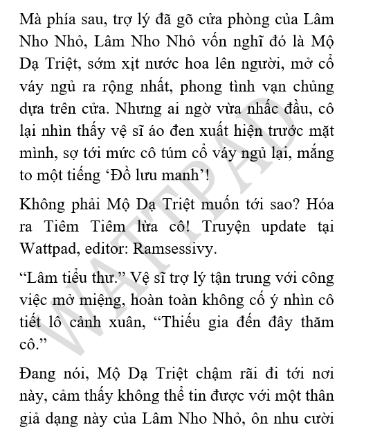 "Đừng kết hôn!" Cô thốt ra câu này trước mặt Mộ Dạ Triệt, ngay sau đó lại nói: "Ý của tôi là, Mộ thiếu gia không cần theo lệnh của cha mẹ, đi cưới một cô gái mà mình không thích, như vậy sẽ khiến hai người thống khổ. Nhưng mà nếu Mộ thiếu gia đã sớm có hôn phối, tôi cũng nguyện ý theo anh nói chuyện phiếm, cho dù là thời điểm nào, tôi đều chờ anh, pha trà cho anh." Cô vẫn nói nhu tình như nước, dịu dàng nhìn Mộ Dạ Triệt.