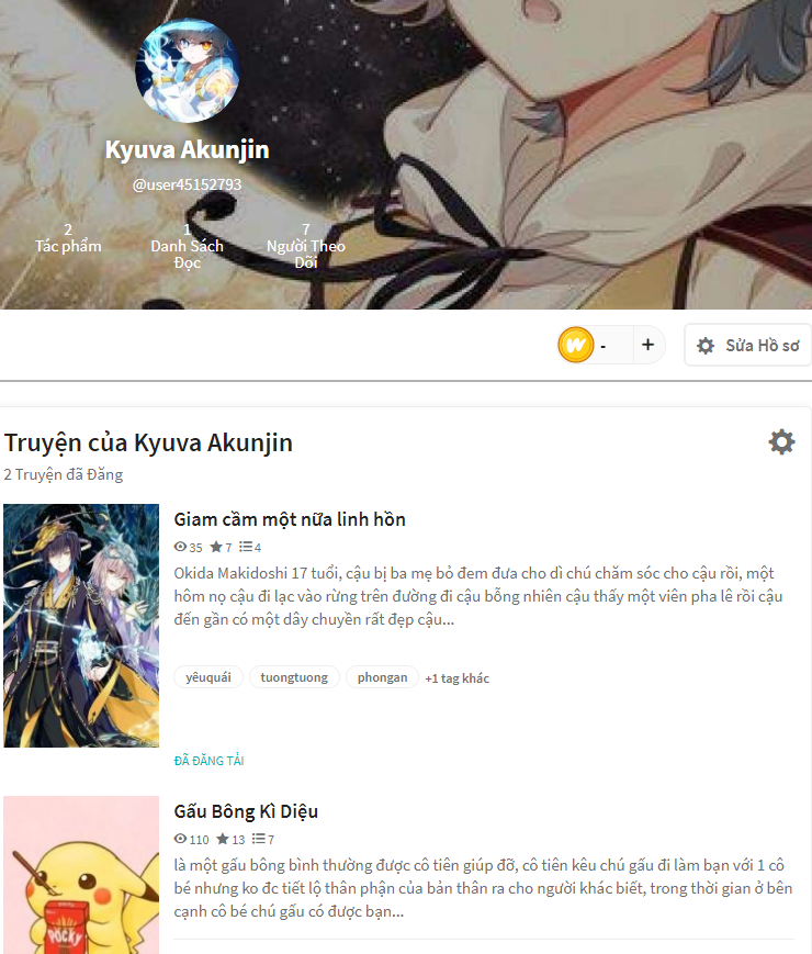 Mik bùn nhẹ tại sao bây giờ Gấu Bông KỲ Diệu ms đc 110 lượt xem mà trog khi đs ngw ta lm sao mik mà đc 146 lượt xem hơn mà 13 lượt bình chọn như thế cũg đỡ còn về phần Giam cầm một nữa linh hồn của yêu quái thì đã đc 35 lượt xem và 7 lượt bình chọn ms ra mà như vậy cũg đỡ hơn rùi nhờ thế mik ms có hứng lm truyện tiếp, hiện tại truyện Gấu Bông Kỳ Diệu và Sự lẫn lộn giữa các chiều không gian by: aki yuko có thể tìm thấy trên google còn Giam cầm một nữa linh hồn của yêu quái chắc ko có.