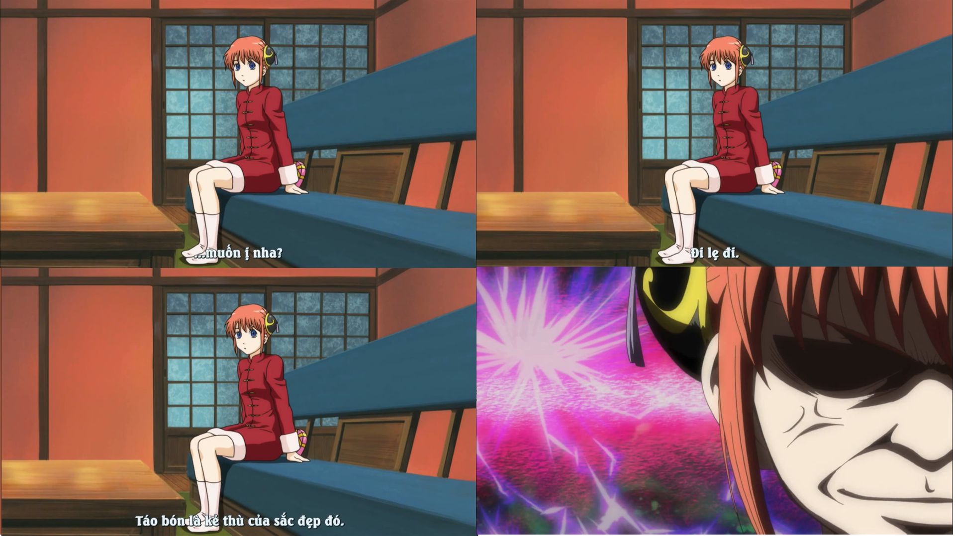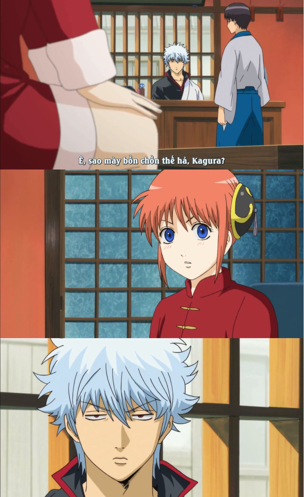 Kagura càng lúc càng duyên, càng tỏ ra người lớn hơn là bởi những cái lúc này đấy. Nếu như bình thường, tính cách vẫn còn trẻ con như trước thì kiểu gì em cũng bắt chước, lăn ra ăn vạ đòi đình công giống như Gin-chan, rồi cuối cùng Shinpachi lại phải dọn dẹp hậu sự của cả hai đứa. Lần này thì không vậy.