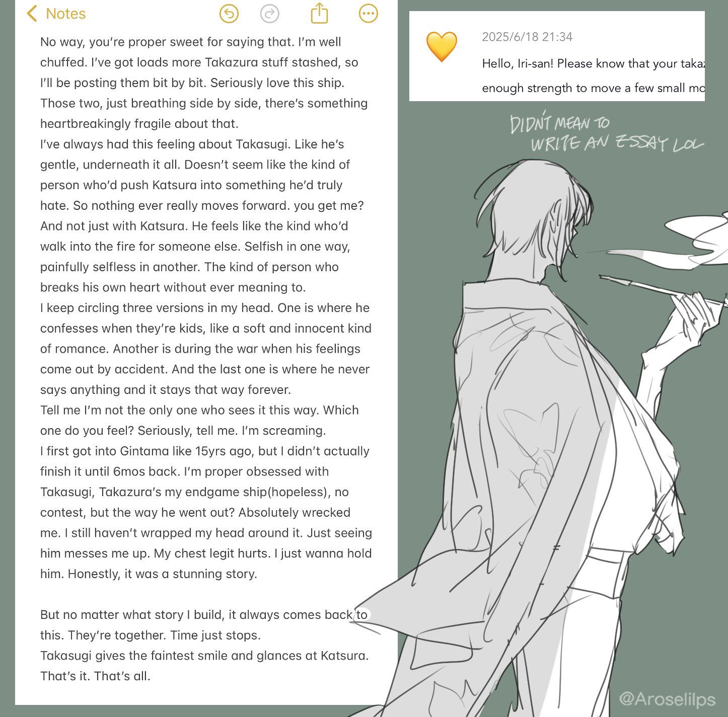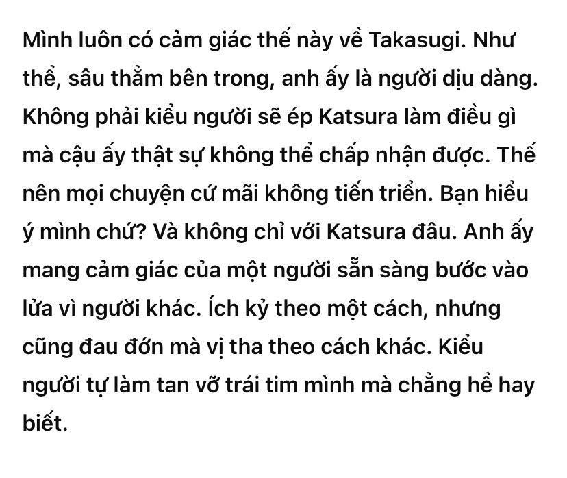Tớ luôn có cảm giác về Takasugi. Như thể anh ấy dịu dàng, sâu thẳm bên trong. Không giống kiểu người ép Katsura làm điều anh ấy thật sự ghét. Nên chẳng bao giờ có tiến triển gì. Hiểu ý tớ không? Và không chỉ với Katsura. Anh ấy cảm giác như kiểu người sẵn sàng bước vào lửa vì người khác. Ích kỷ theo một cách, nhưng cũng đau đớn hy sinh theo cách khác. Kiểu người tự làm tan nát trái tim mình mà không hề cố ý. Tớ cứ nghĩ mãi về ba phiên bản trong đầu. Một là anh ấy tỏ tình khi cả hai còn nhỏ, kiểu lãng mạn trong sáng và ngây thơ. Hai là trong chiến tranh, cảm xúc vô tình bộc lộ. Và cuối cùng là anh ấy chẳng bao giờ nói gì, và mọi thứ cứ thế mãi mãi. Nói tớ nghe, không lẽ chỉ mình tớ nghĩ vậy? Cậu cảm phiên bản nào nhất? Nghiêm túc đấy, kể tớ nghe. Tớ đang gào thét đây. Tớ biết đến Gintama cách đây 15 năm, nhưng mãi 6 tháng trước mới xem xong. Tớ bị ám ảnh Takasugi luôn. Takazura là cặp cuối cùng của tớ (vô vọng), không có đối thủ, nhưng cái cách anh ấy ra đi? Hủy hoại tớ hoàn toàn. Tớ vẫn chưa thể chấp nhận nổi. Chỉ cần thấy anh ấy là tớ rối bời. Ngực tớ đau thật sự. Tớ chỉ muốn ôm anh ấy. Thành thật mà nói, đó là một câu chuyện tuyệt vời.