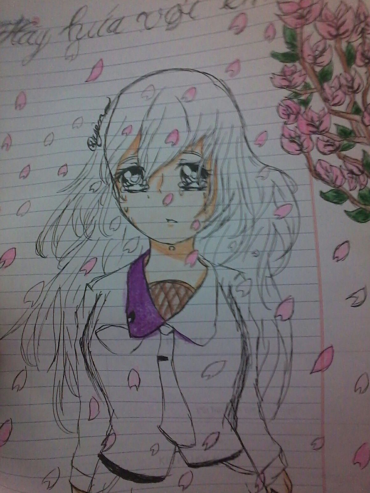 (Nếu vẽ bút chì sẽ đẹp hơn, nhưng là trong giờ học nên cứ vớ lấy cái bút bi vẽ đại thôi, tóc bị Fail, hoa rơi thì nhiều quá, ngực cũng Fail nữa)