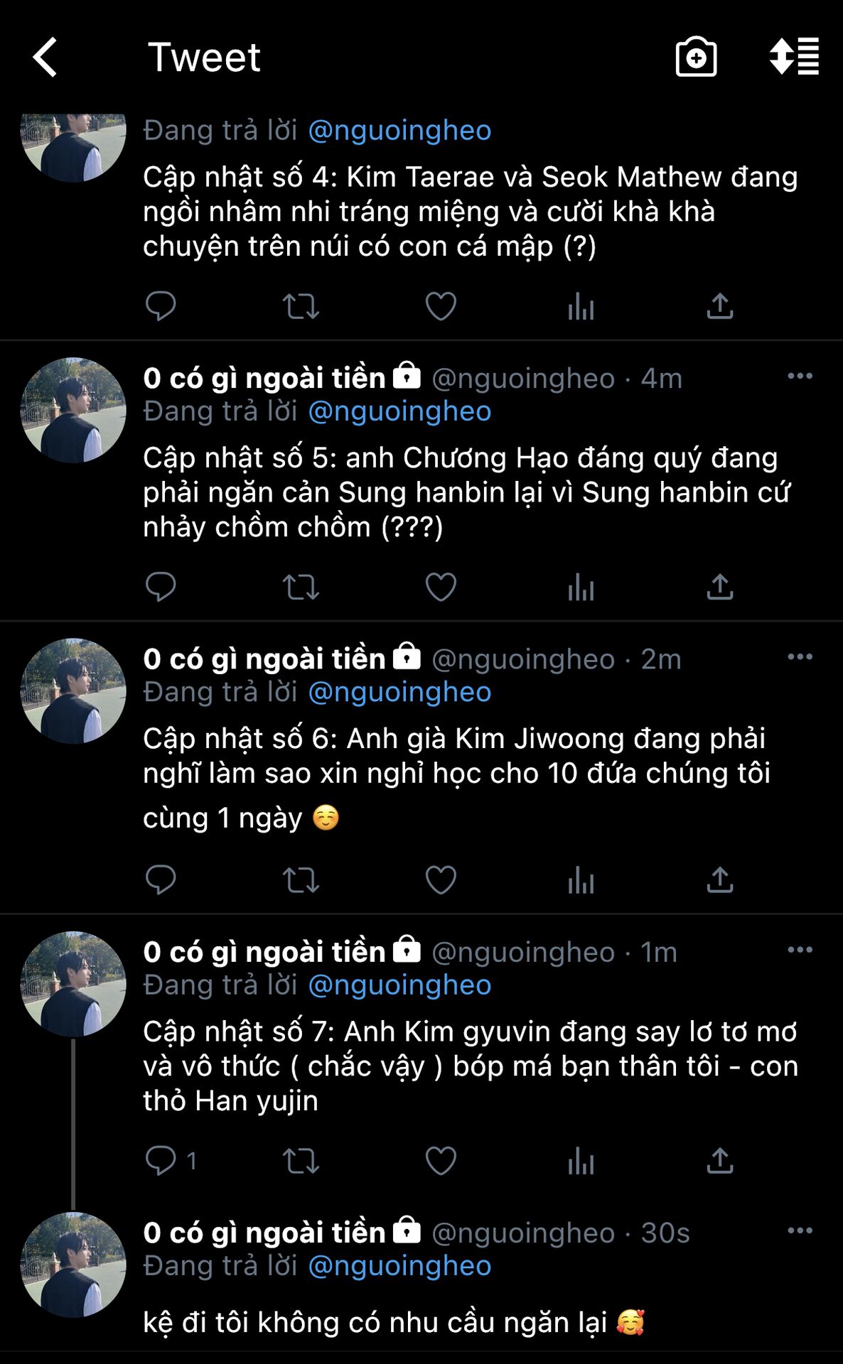 tình hình là hôm nay mình không định lên chap đâu 😞 tại hôm qua mình chúc người ta ngủ ngon mà người ta không chúc lại nên mình bị buồn 😞 nhưng mình vẫn lên tại mình yêu các bạn rấc nhìu 😉