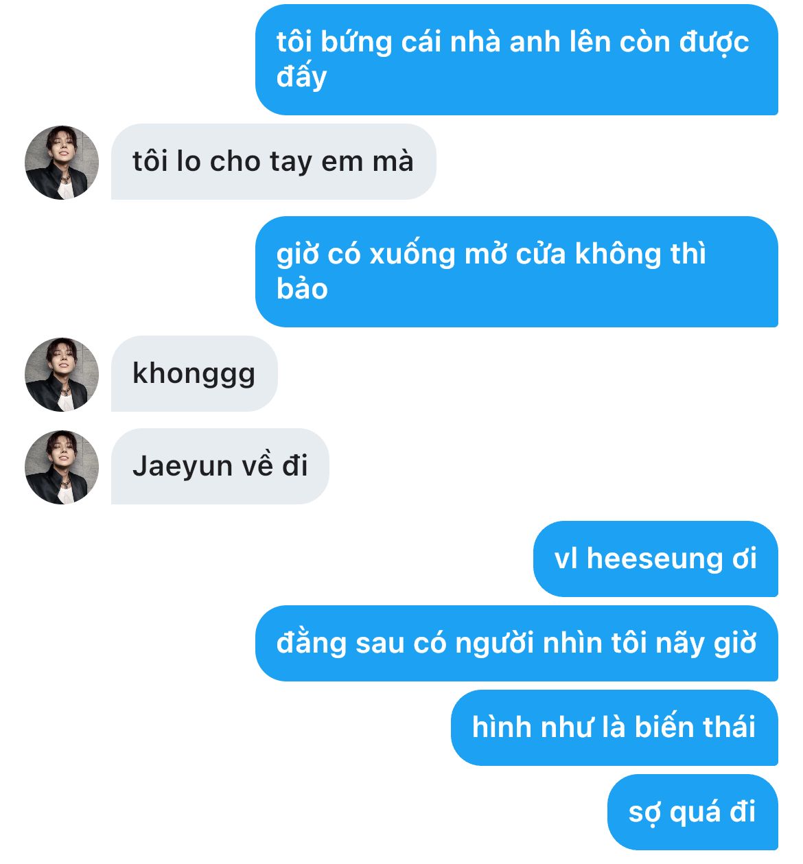 "Jaeyun lừa tôi..." - hắn vịn tay vào thành cửa mà cúi xuống, cố hớp lấy từng ngụm không khí còn sót lại sau quãng đường lao thân giải cứu em, mặc dù em chẳng bị gì cả, cũng chẳng có ai ở đó nhìn em nốt. Ừ thì là em bịa ra đó, nhưng không nói dối thì liệu đến bao giờ hắn mới chịu ra mở cửa cho em, sức cún cũng có giới hạn thôi chứ?