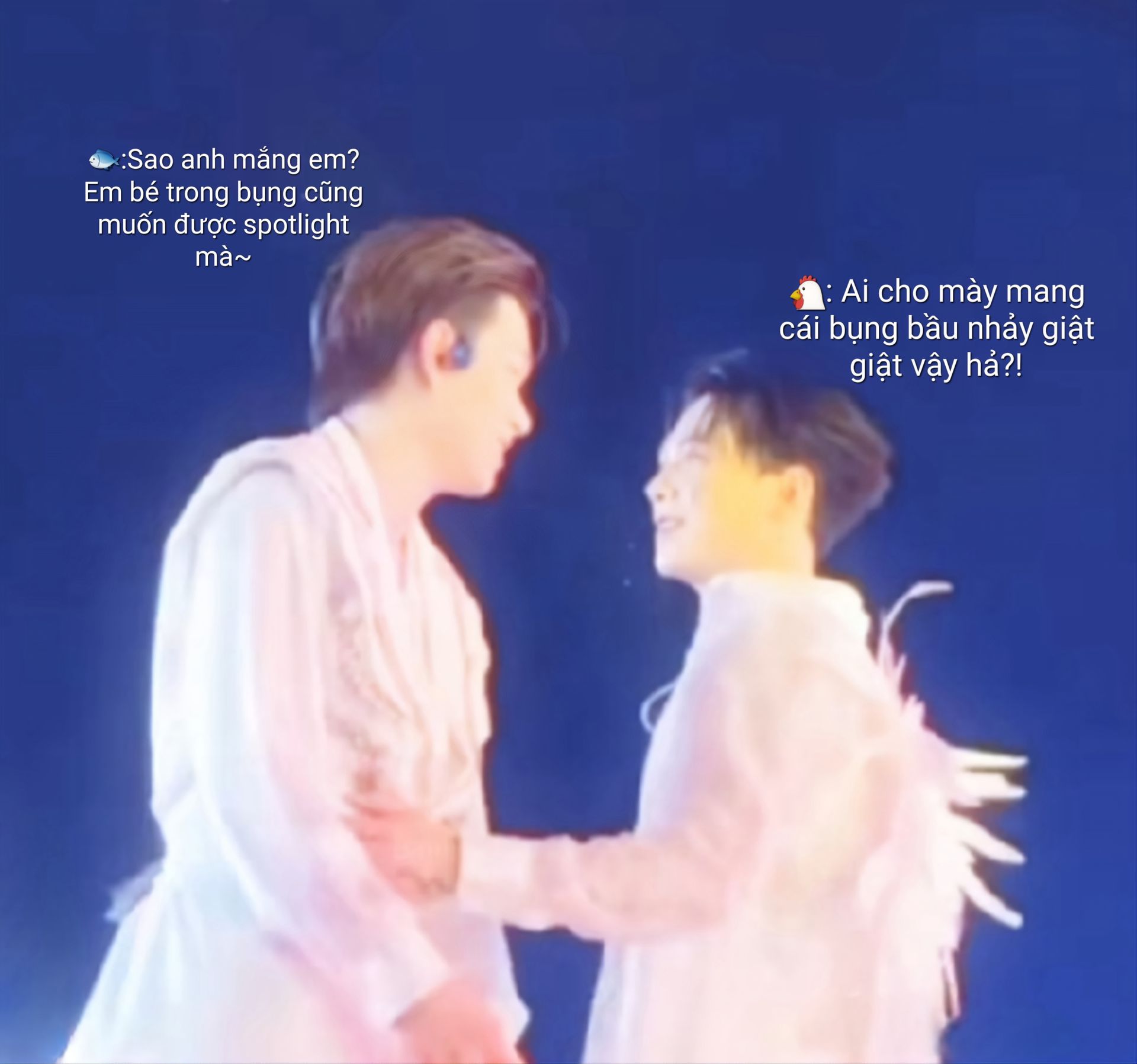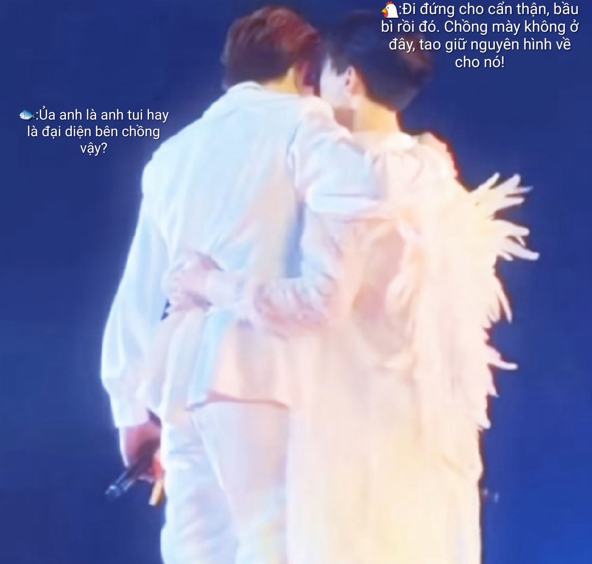 Tiếng nhân viên điều chỉnh ánh sáng vang lên trong bộ đàm, tiếng giày chạy rộn ràng lẫn với tiếng thử micro tạo thành một hỗn hợp âm thanh hối hả. Vậy mà, ở giữa tất cả những âm thanh đó, khoảng không giữa hai người gần như khép kín.