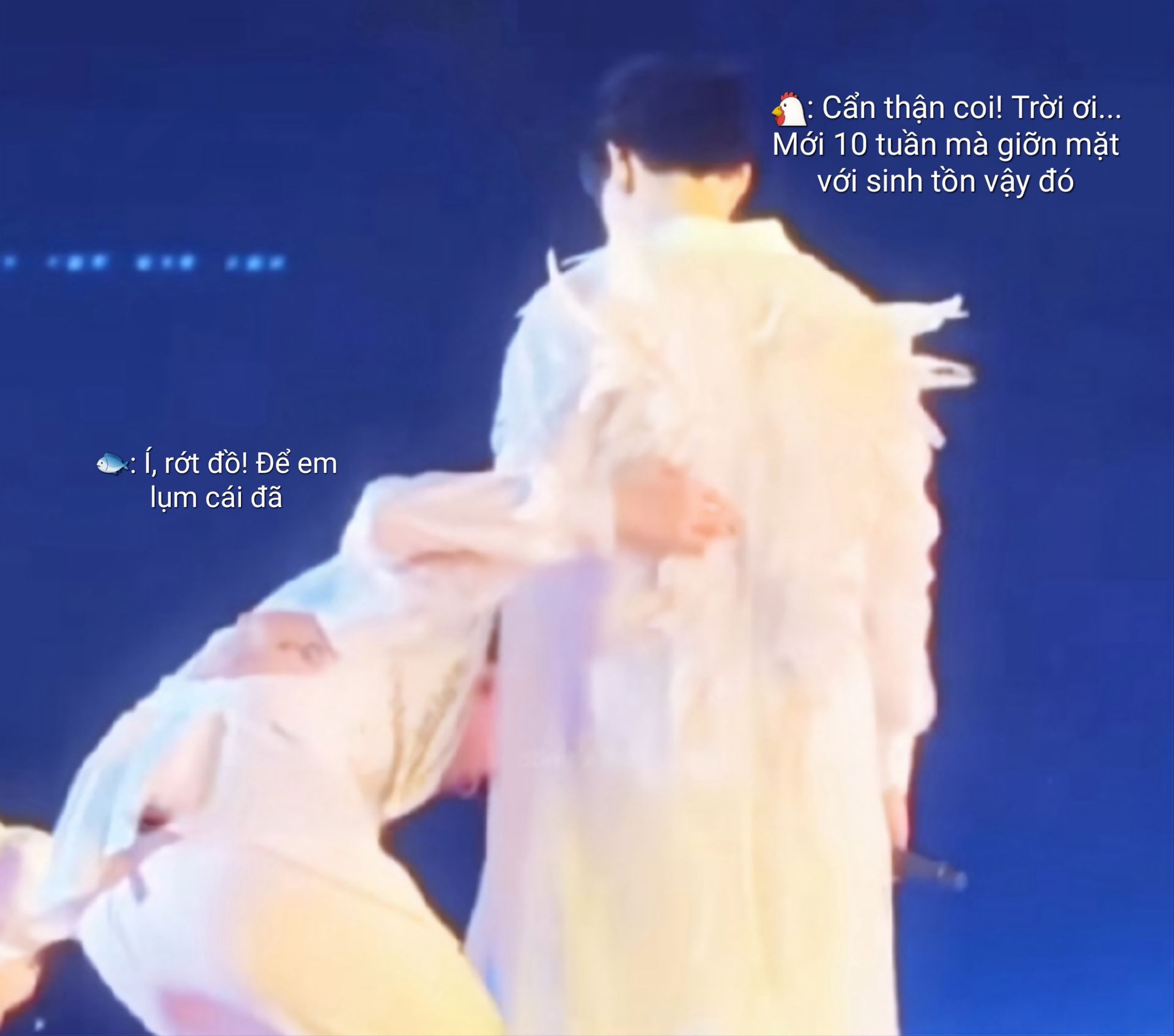 Bảo Khang nuốt khan, lấy tay che miệng để ngăn tình trạng dở khóc dở cười, "Thằng Hiếu đứng im mà răng với tay nó thiếu điều muốn rụng rời luôn kìa."