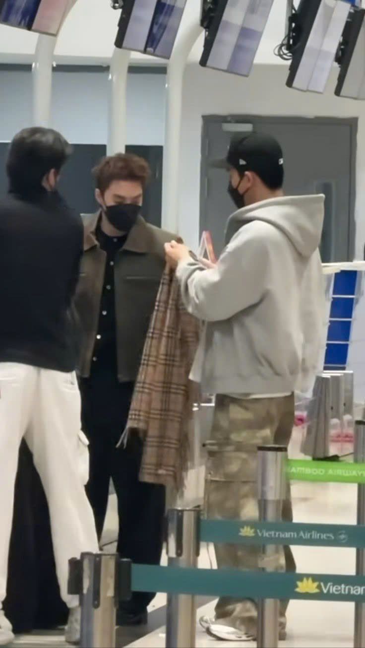 Thành An đứng cạnh vali của mình, tay ôm một chồng vé máy bay và passport, ánh mắt len lén liếc nhìn phía sau, nơi có một người đang cầm chiếc khăn choàng nâu kẻ sọc.