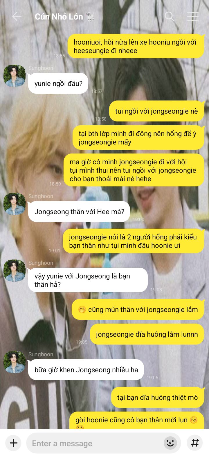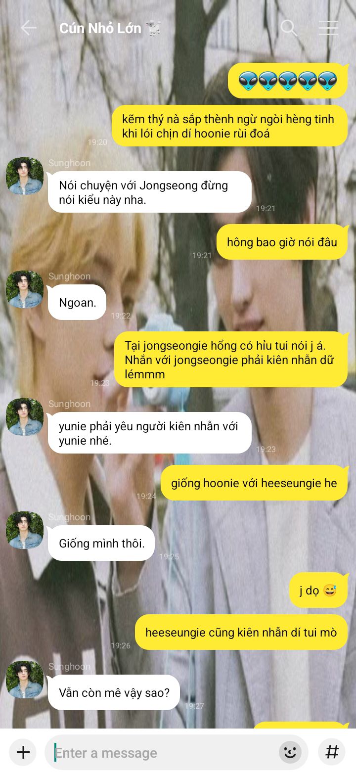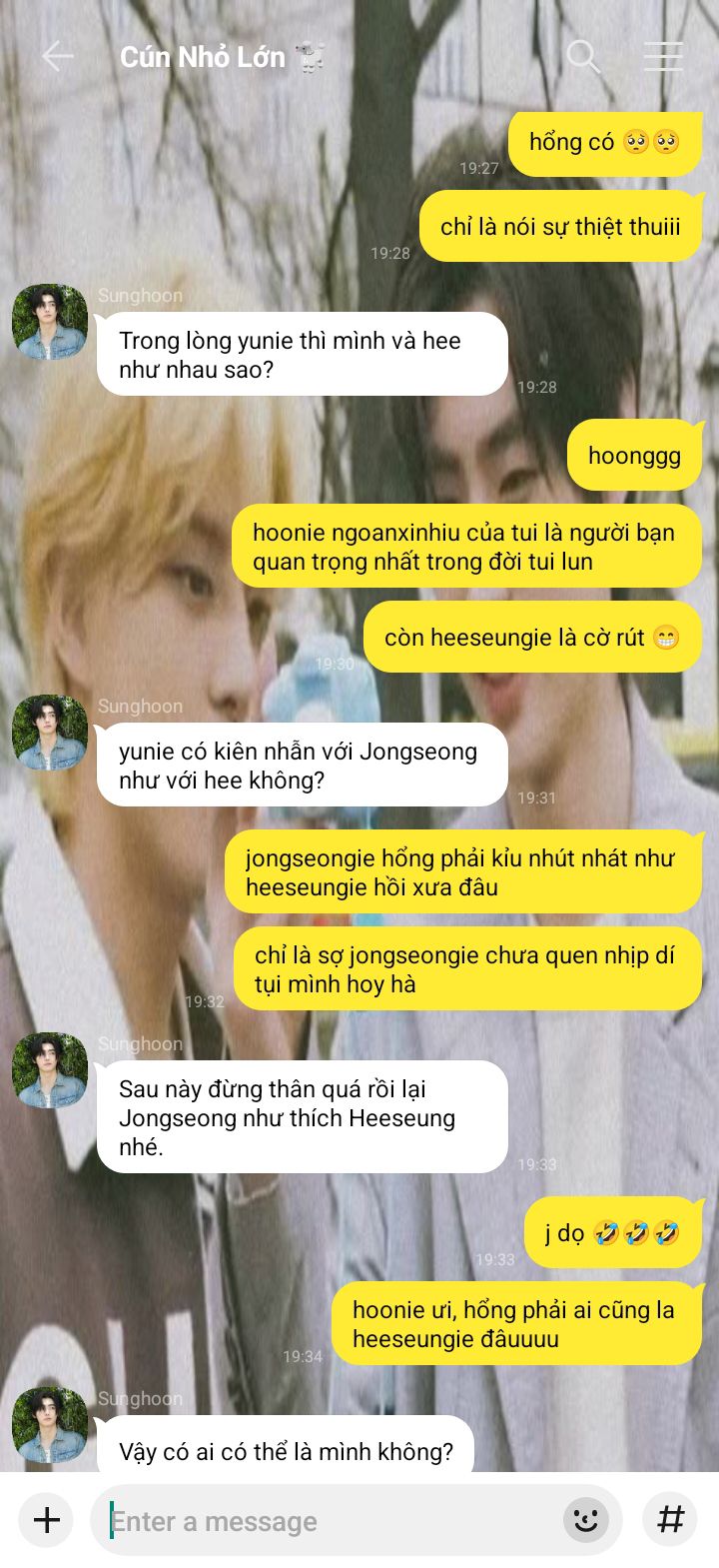 Jaeyun chắc là người thân thiện nhất mà Jongseong từng biết, bạn nhỏ dễ thương cứ liên tục bắt chuyện hỏi han rồi nói mọi thứ trên trời dưới đất cho nó nghe với đôi môi trái tim dày mọng chu chu như em bé.
