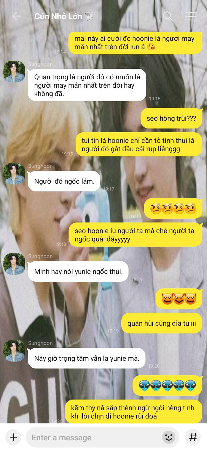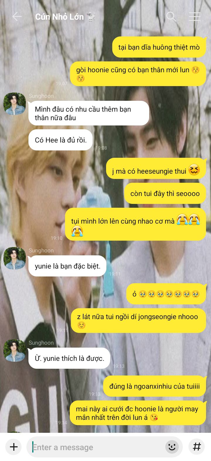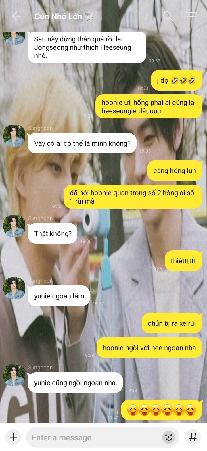 Jaeyun chắc là người thân thiện nhất mà Jongseong từng biết, bạn nhỏ dễ thương cứ liên tục bắt chuyện hỏi han rồi nói mọi thứ trên trời dưới đất cho nó nghe với đôi môi trái tim dày mọng chu chu như em bé.