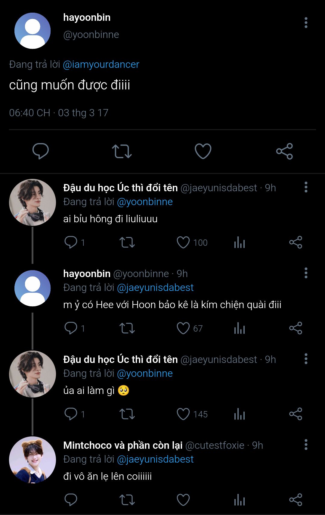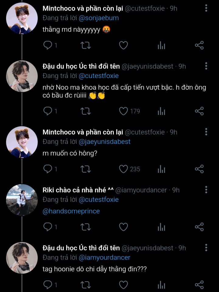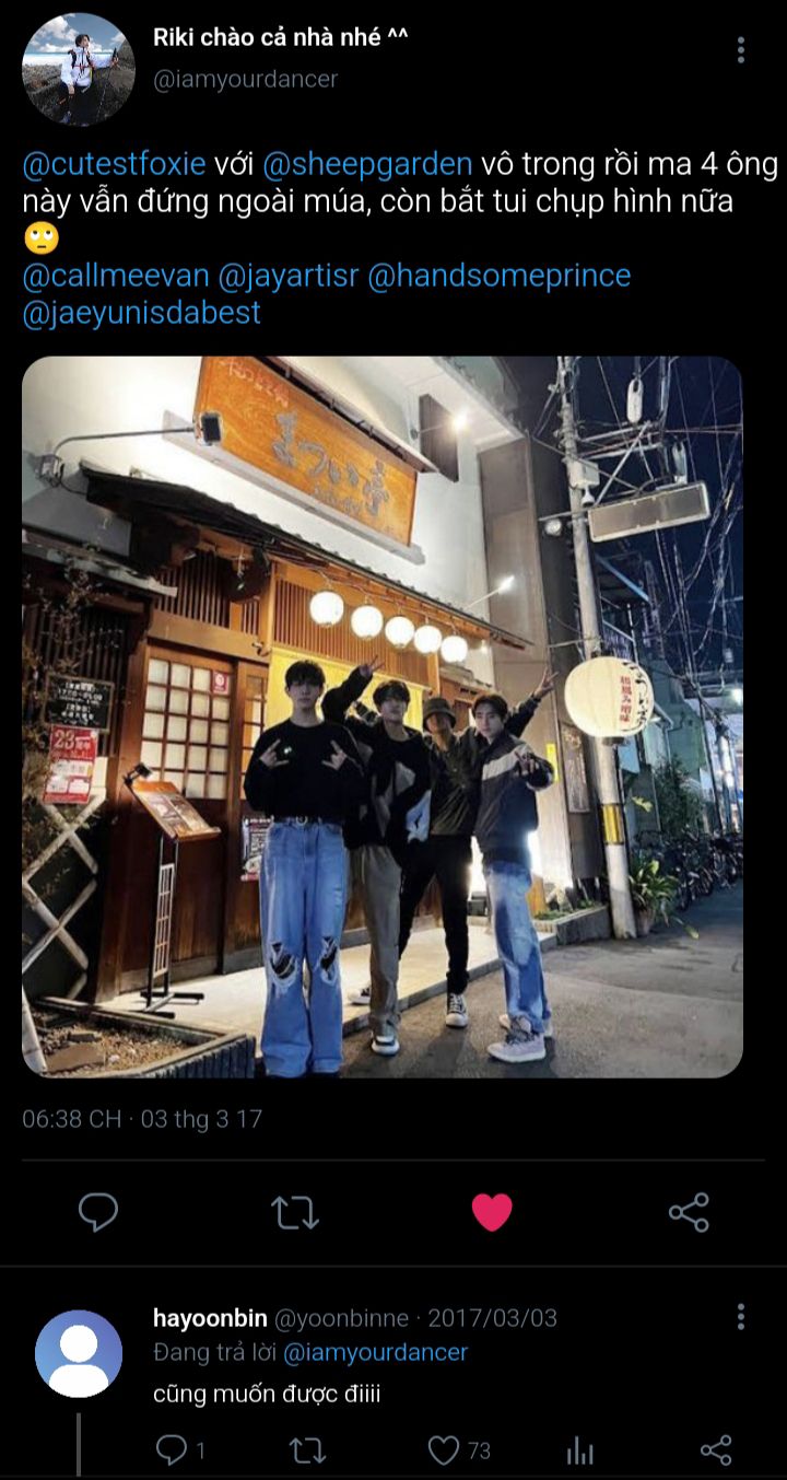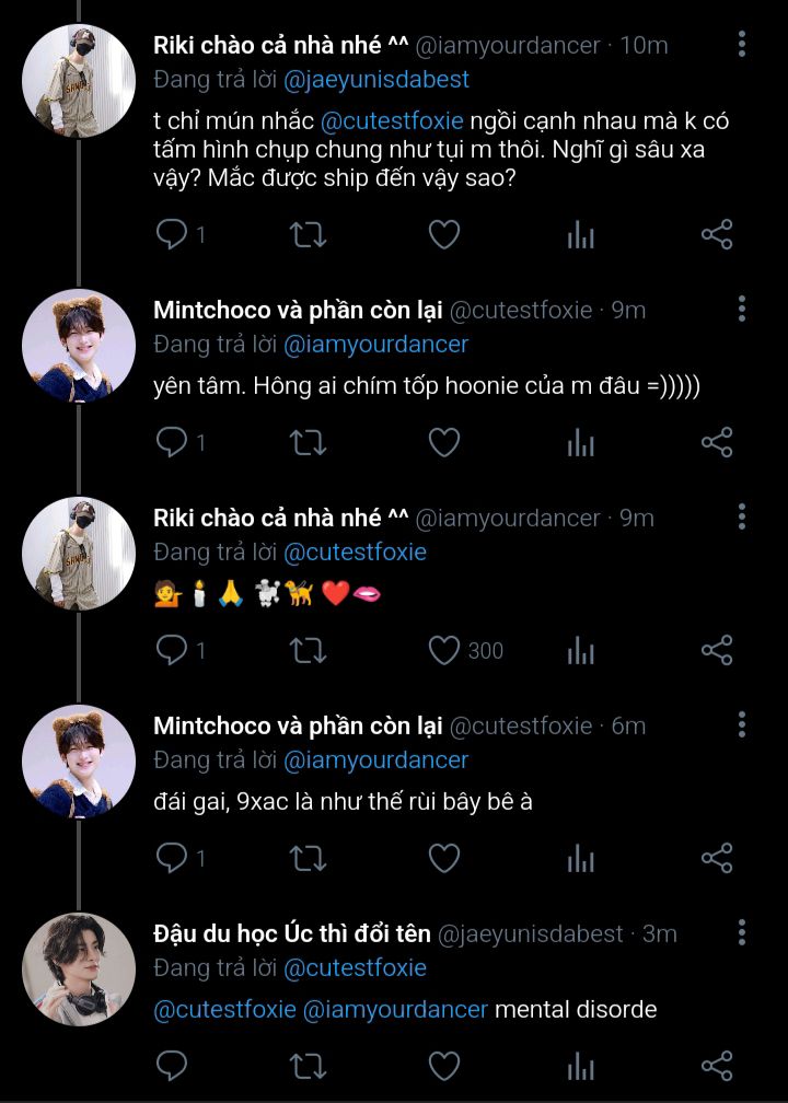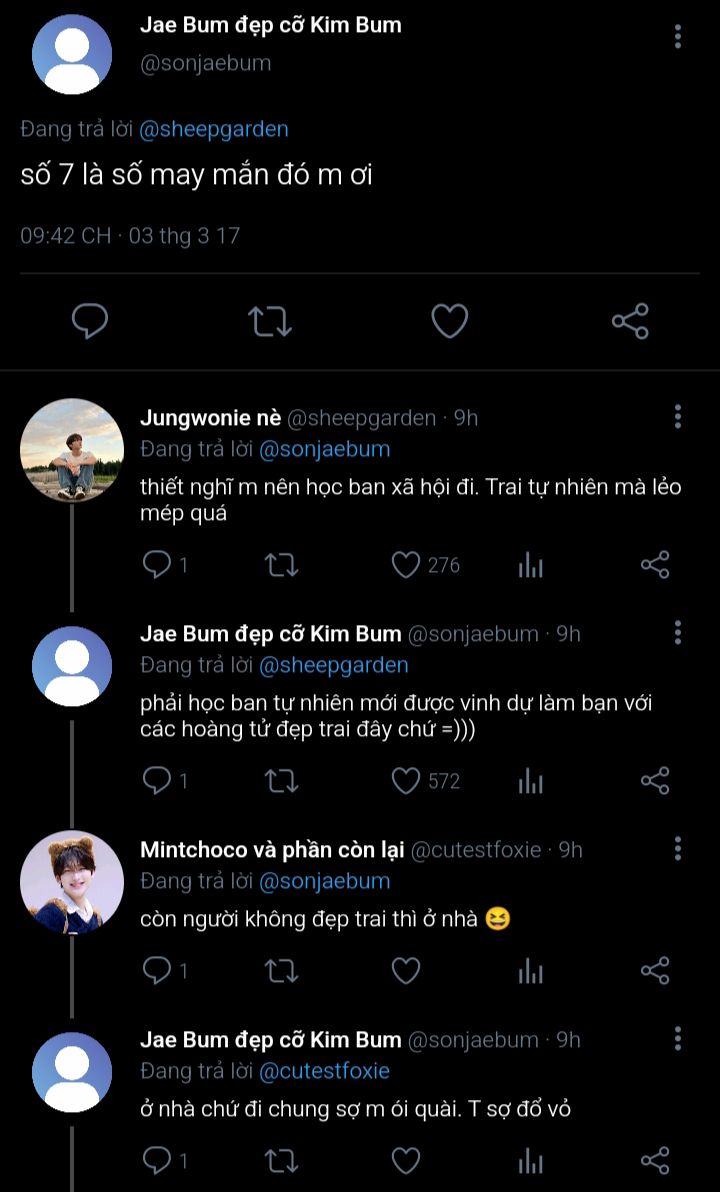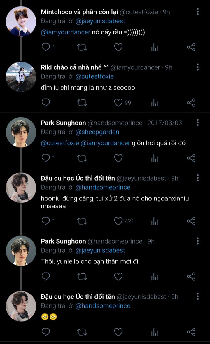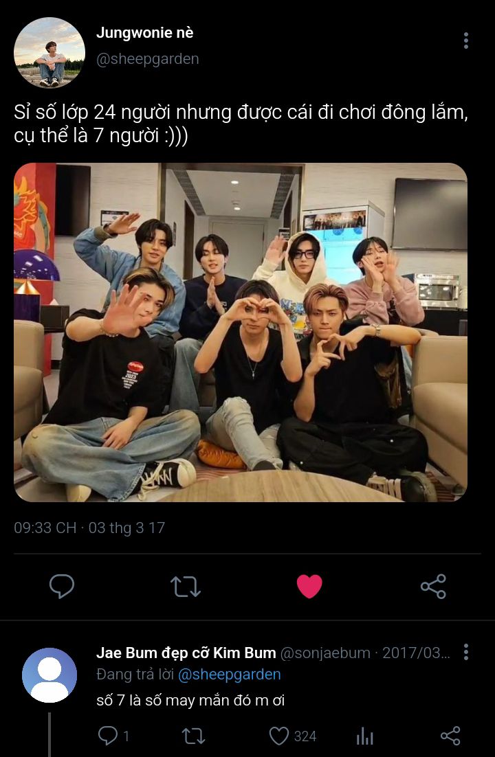 Jongseong không nhận ra bản thân chỉ ngồi đúng một kiểu tựa lưng nửa ở cửa sổ, nửa ở thành ghế để tiện nghe và nhìn Jaeyun nói suốt từ lúc Jaeyun lên xe ngồi kế bên đến khi xe chạy tới nhà nghỉ. Lúc xuống xe nó còn ngẩn người ra, không hiểu sao thấy cơ miệng mình mỏi dù cuộc hội thoại của hai đứa nó chỉ góp cùng lắm là 30% âm thanh. Phải rồi, nó cười liên tục với Jaeyun chứ sao nữa (sau này nó mới nghiệm ra được).