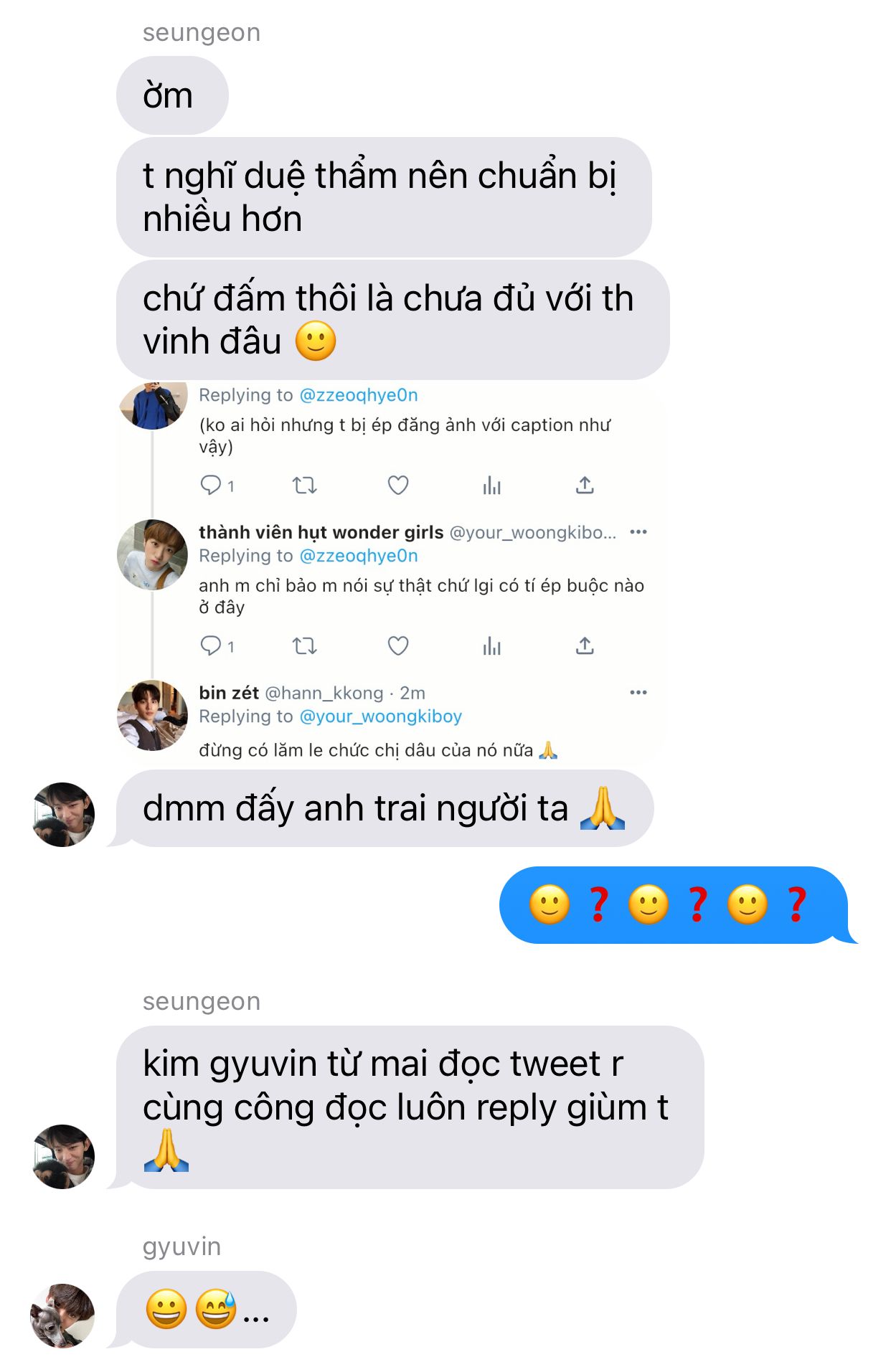 cứ thử tưởng tượng cảnh thẩm thiếu gia lao tới xé toạc cái miệng của kim gyuvin để từ nay về sau nó khỏi ăn nói vớ vẩn đi... trông sẽ kì cục lắm, chưa kể còn có anh jeonghyeon và cả chục người bên khoa nhiếp ảnh đang ở trong đó nữa... tóm lại ricky không phải phường côn đồ, không thể làm vậy được!