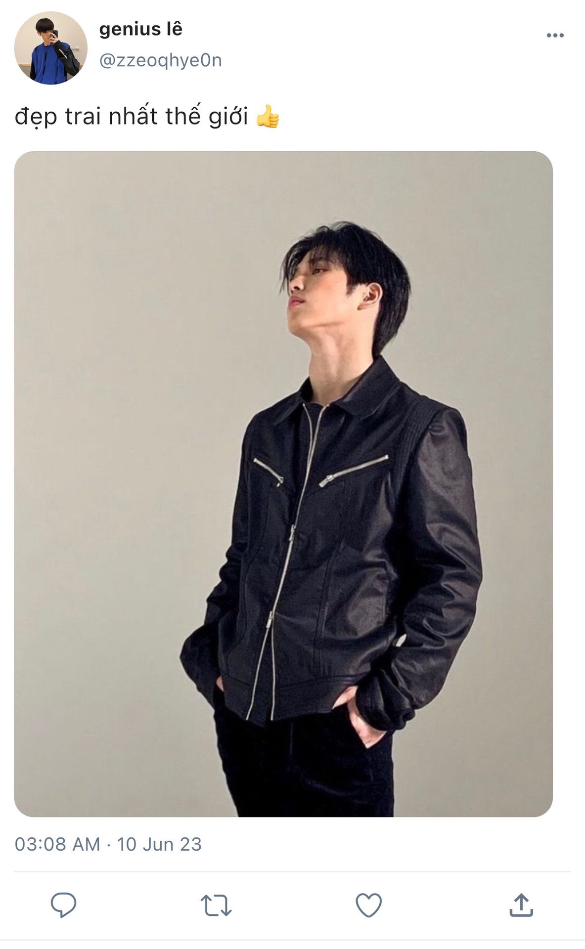 lee jeonghyeon dường như nghe được ngữ điệu dò hỏi lạ lùng của em, liền tiến tới chỉnh lại mái tóc bạch kim vừa nãy bị vò rối tung cả lên, vừa chỉnh vừa nhẹ nhàng nói, "là anh trai anh thôi. cái ông anh influencer trên instagram mà em bảo táo bạo hôm trước đó. giờ xong việc rồi nên anh đang định về này."