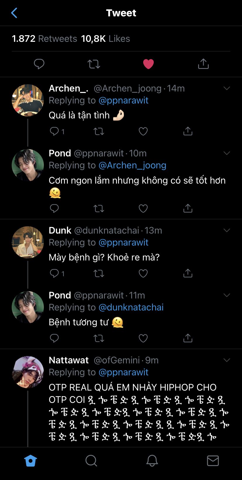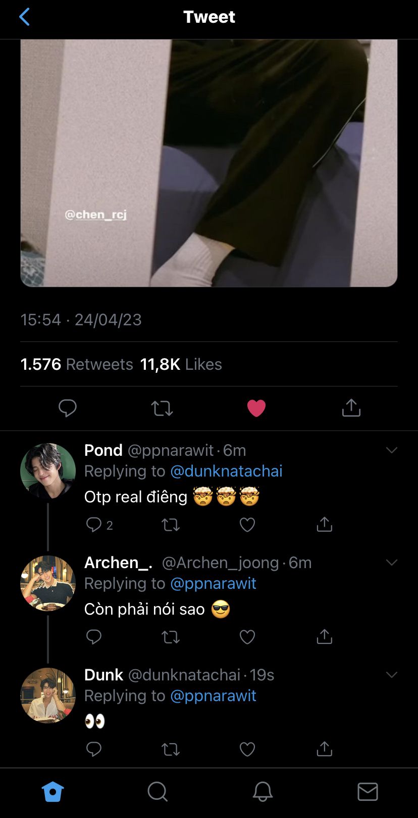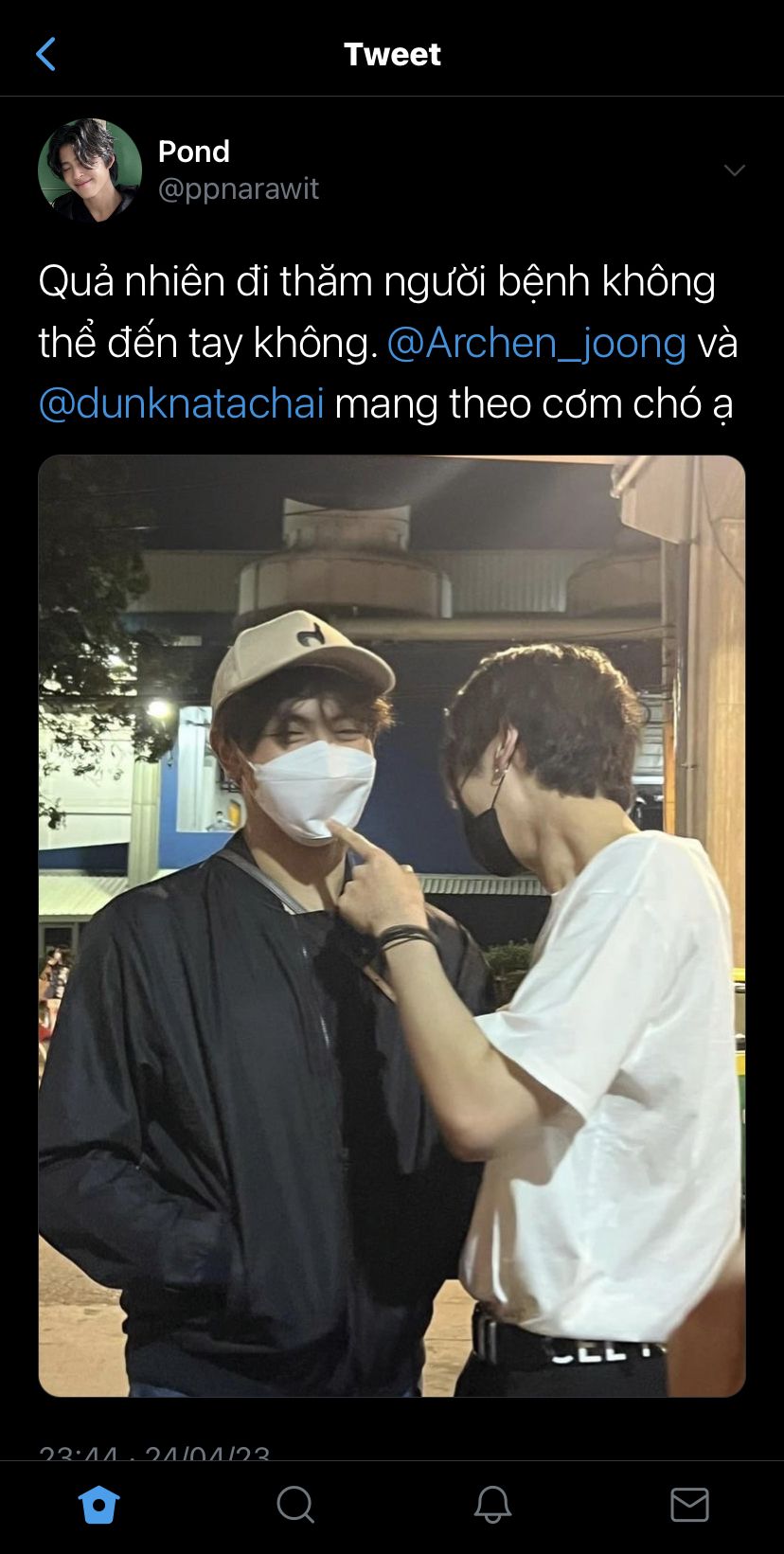 Cả hai nhanh chóng lên xe lái đến condo của Pond. Khi còn ngồi trong xe, Dunk trong lúc chọn nhạc thì nhận được thông báo Phuwin vừa có một tweet mới, vội vàng lên xem.
