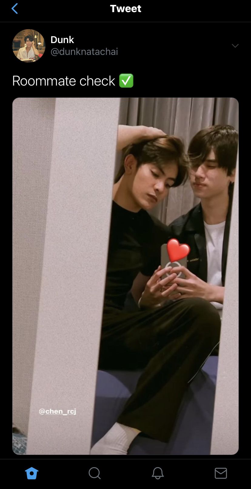 Đến condo Pond rồi cùng nhau đi hát karaoke, đến phòng tập để nhảy, xả được mớ tâm sự ra ngoài, cũng khiến cho cơ bắp mỏi mệt hoàn toàn để có thể dễ dàng tìm tới giấc ngủ. Trước khi Joong và Dunk về, Pond nhanh tay giơ điện thoại chụp lại một tấm.