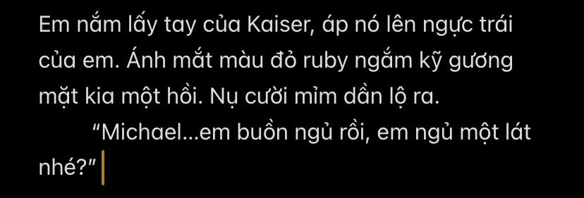 Em lắc đầu rồi nằm xuống trong vòng tay của Kaiser, vùi đầu vào trong cơ ngực săn chắc thoáng thoảng mùi hương đầy sự nam tính.