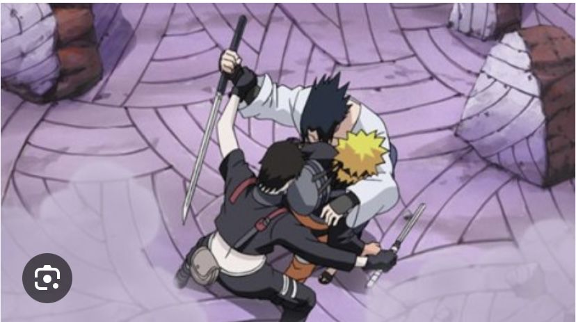 Sai giữ chặt tay cầm kiếm của Sasuke không để hắn gây hại cho Naruto nhưng Naruto cũng chặn lại công kích của hắn