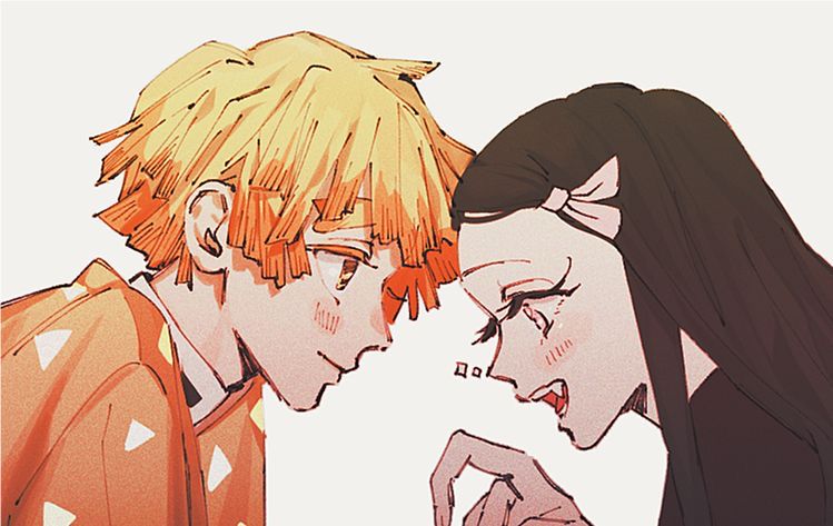 Nezuko nhìn cậu, nở nụ cười để lộ ra răng nanh nhọn dài nhưng cậu không quan tâm, cô bé vẫn rất dễ thương và xinh xắn! Lắp bắp những câu từ rời rạc, Zenitsu khó hiểu