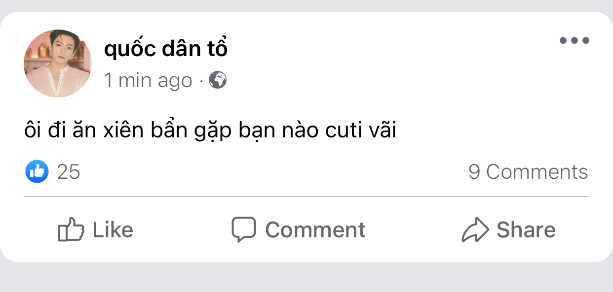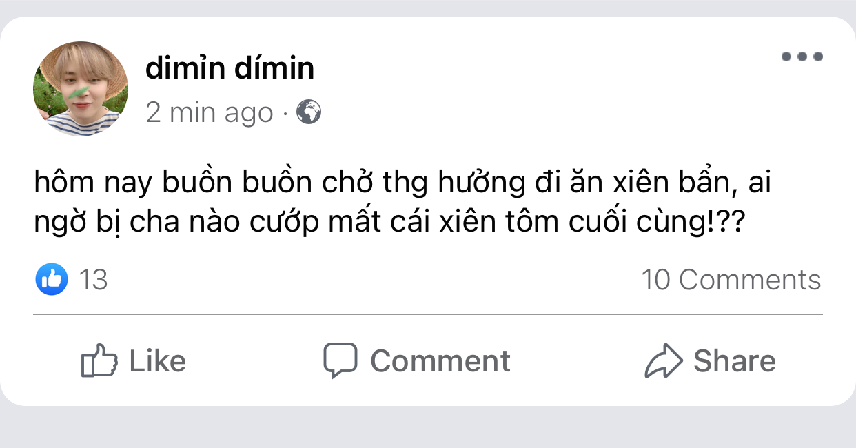 cậu đứng chọn xiên thuần thục như thể 17 năm trời chỉ ăn xiên bẩn thay cơm. tay đang với lấy chiếc xiên tôm cuối cùng trên sạp thì bỗng bị một bàn tay khác chặn lại. ông bà ta có câu trời đánh tránh miếng ăn, trí mân trợn to mắt, quay ngoắt sang nhìn xem kẻ nào to gan dám mạo phạm tới trẫm thì act cool đứng hình mất chục giây.