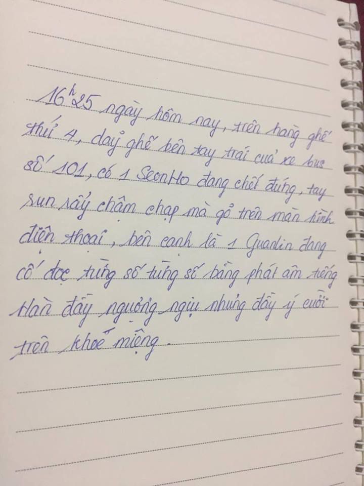 "Là mình nghe nói tiếng Hàn chưa sỏi nên rất ngại, đành dùng tiếng Anh! Nhưng mình đọc viết khá tốt. Mình nhận ra cậu! Xin lỗi lúc nãy vô tình nhìn vào điện thoại cậu, vừa hay có nhắc tới MÌNH, cho nên mình cư nhiên cho mình quyền đọc tiếp. Giờ mình có thể xin lỗi cậu bằng cách...cho cậu số của mình. Có được không?"