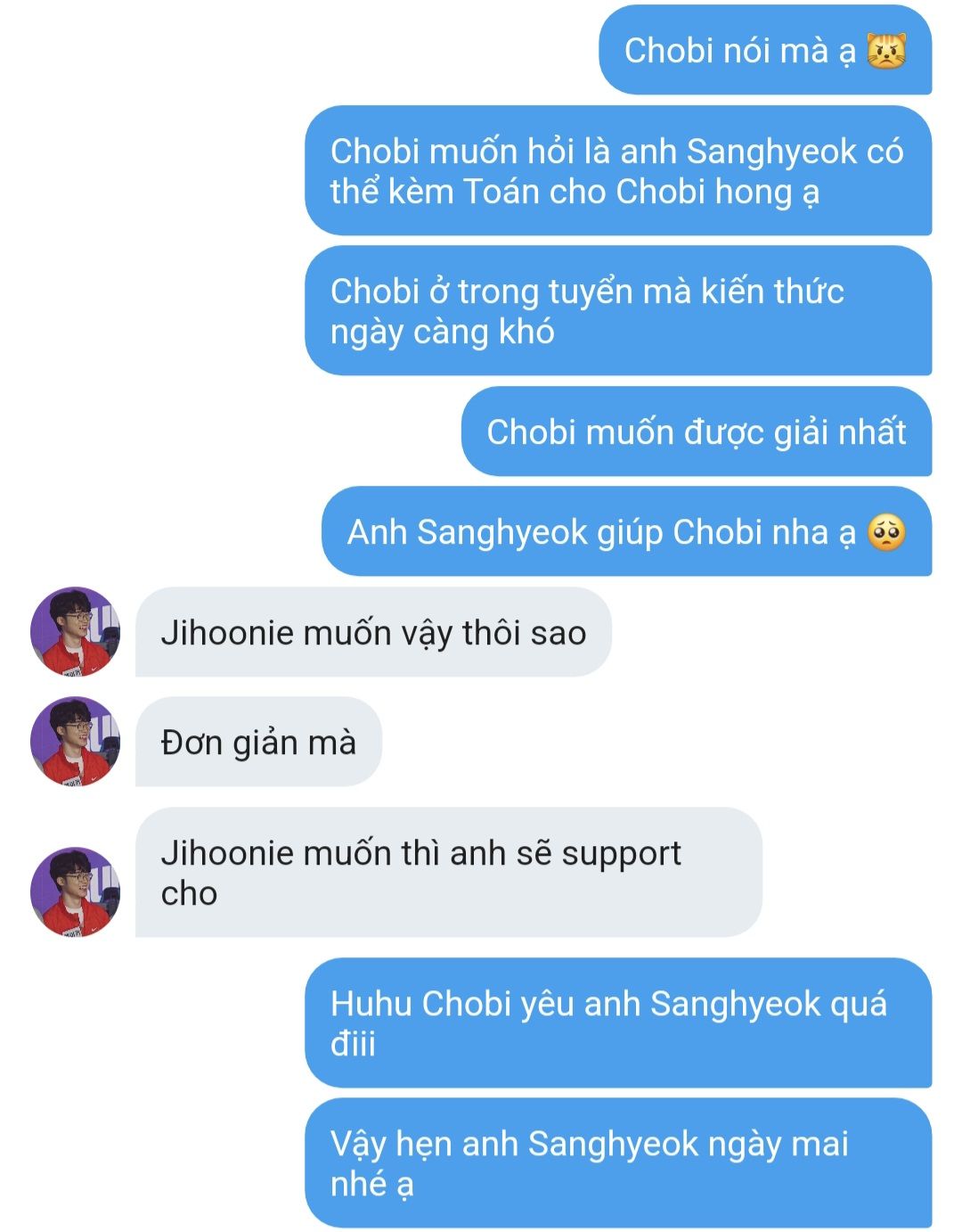 "Anh Sanghyeok bận như vậy mà Chobi còn làm phiền anh dạy kèm. Mai Chobi sẽ tự học ạ"