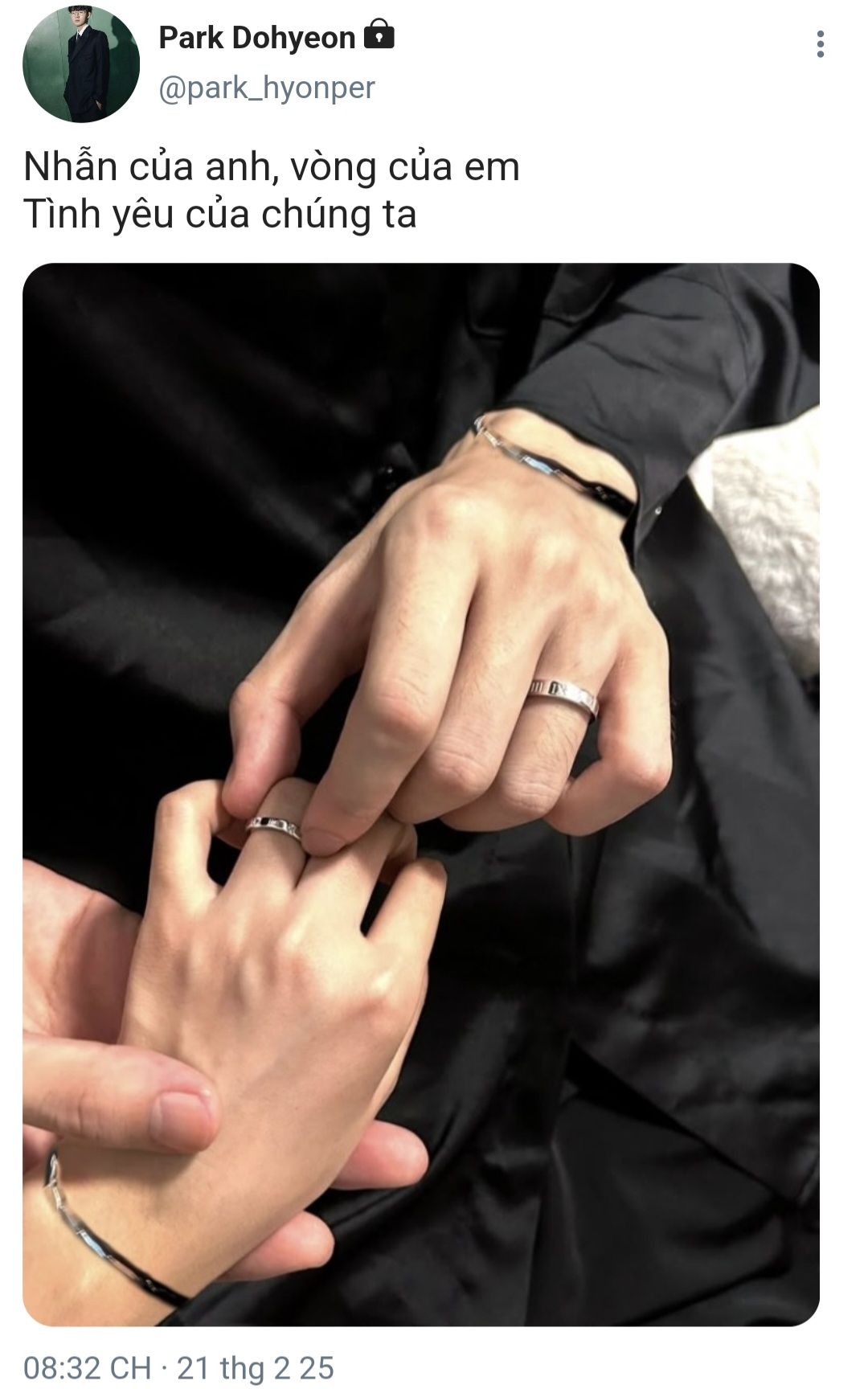 "Anh biết là chúng ta có nhẫn kỉ niệm một năm rồi nhưng mà anh muốn có nhẫn mới. Đánh dấu cho chuyện tình của chúng ta sang một trang mới tốt hơn. Thế nên Park Dohyeon, anh có thể đeo nhẫn cho em không?"