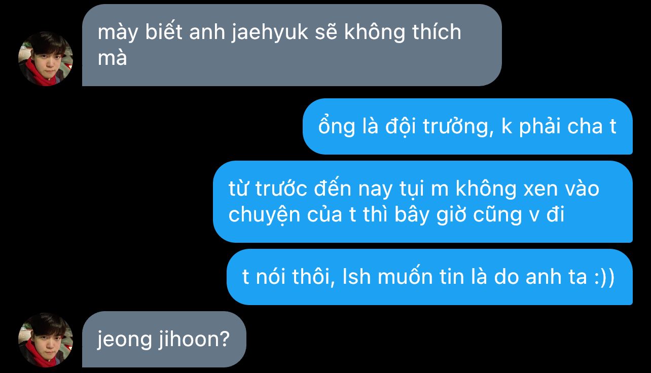 han wangho hoàn toàn không bắt kịp nhịp độ của park dohyeon. cậu ta quá nhanh lẹ, nói quá nhiều, lo quá mức. trong khi han wangho như bị ai yểm bùa, cái mỏ hoạt động năng suất thường ngày bị giảm sức mạnh, phản xạ nhanh lẹ của một cầu thủ biến đâu mất tiêu, buông lỏng cảnh giác để người ta phủ áo lên người.