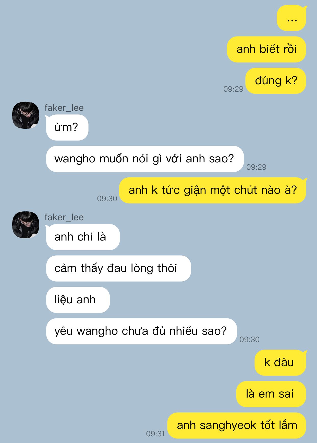 Han Wangho bĩm bĩm môi, tuy Lee Sanghyeok không có lớn giọng gì đâu nhưng cậu cứ thích giả vờ tủi thân xong còn nạt lại anh nữa.