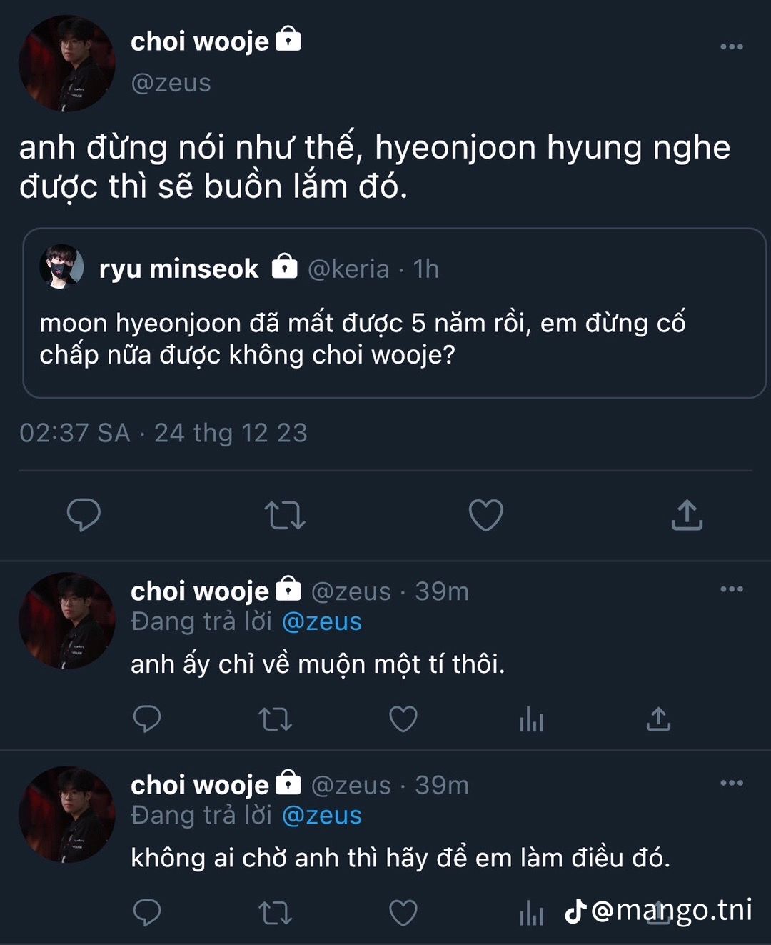 " Bây giờ chắc Hyeonjun đã gặp được Wooje rồi. Hyeonjun ơi, hãy chăm sóc em tớ thật tốt và hạnh phúc nhé " nói xong Minseok khóc nấc lên như một đứa trẻ. Minhyung nghe vậy cũng không kìm nén nổi mà rơi nước mắt theo. Không khí ảm đạm nay còn thê lương hơn nữa, ai ai cũng chìm đắm trong nỗi buồn của riêng mình.